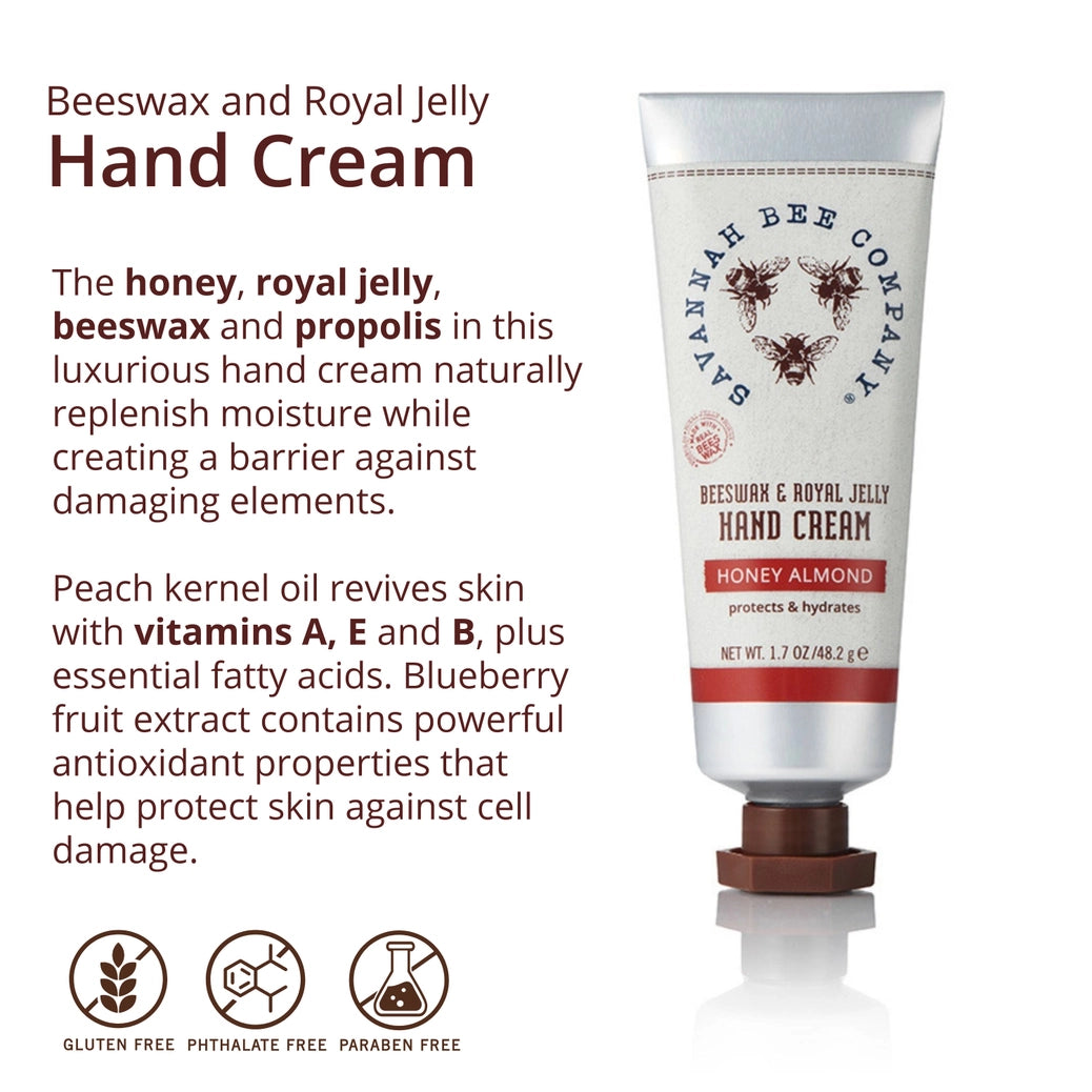Hand Cream: Packed with honey, royal jelly, beeswax, and propolis, this luxe formula locks in moisture and shields your skin from the elements. Peach kernel oil and blueberry extract deliver a boost of vitamins and antioxidants to revive and protect.