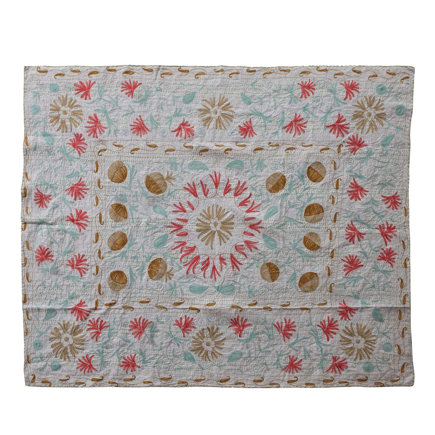 Stonewashed Cotton Voile Printed Two-Sided Throw w/ Suzani Pattern & Hand-Embroidered Kantha Stitch, Multi Color