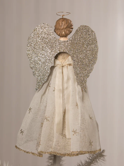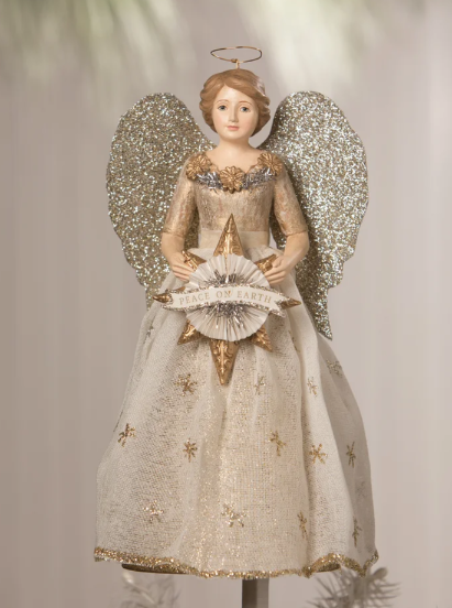Transform your Christmas decor with the Bethany Lowe Peace on Earth Angel Tree Topper. This elegant angel features intricate detailing and fabric accents, holding a metallic gold star with a banner that reads "Peace on Earth". With glittered wings and a delicate halo, she adds a graceful, finishing touch to any tree or mantel.