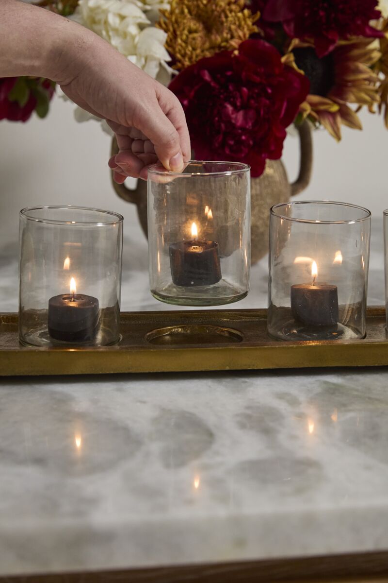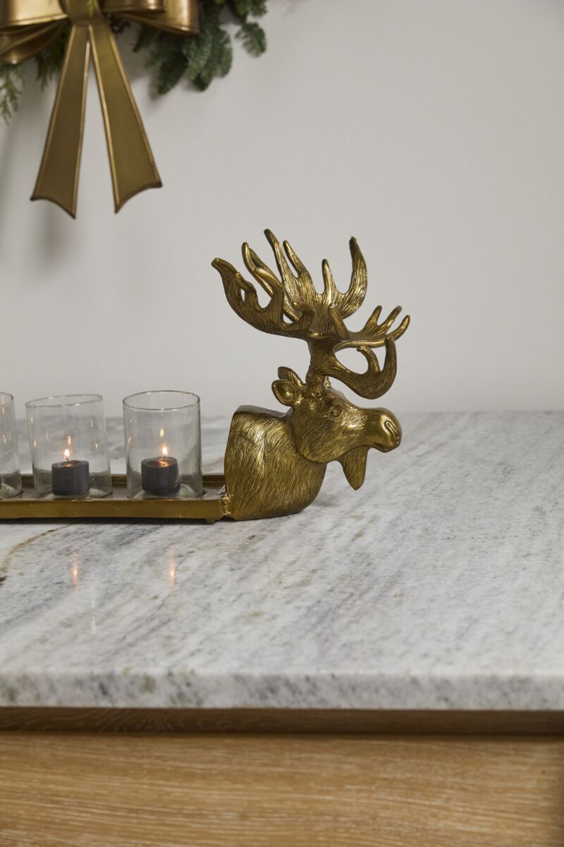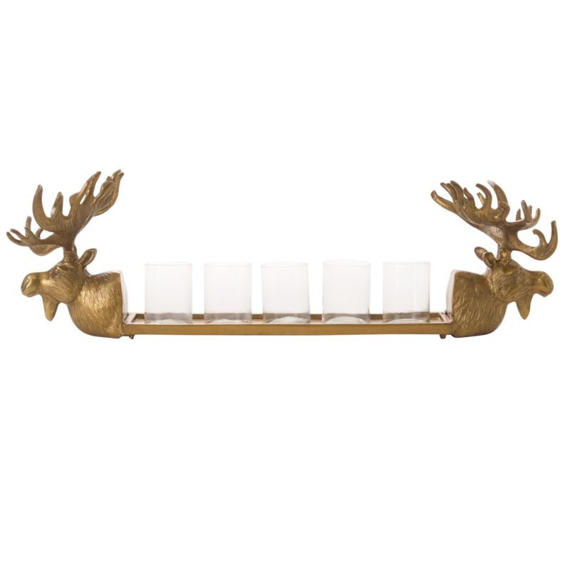 Bring festive cheer with the Moose Candleholder, a playful antique gold tray featuring two charming moose heads at each end. Crafted from recycled cast aluminum, it holds five clear glass votives securely in recessed spots, casting a warm, inviting glow. Perfect for adding a whimsical touch to your holiday table or pairing with nature-inspired decor for a magical ambiance.