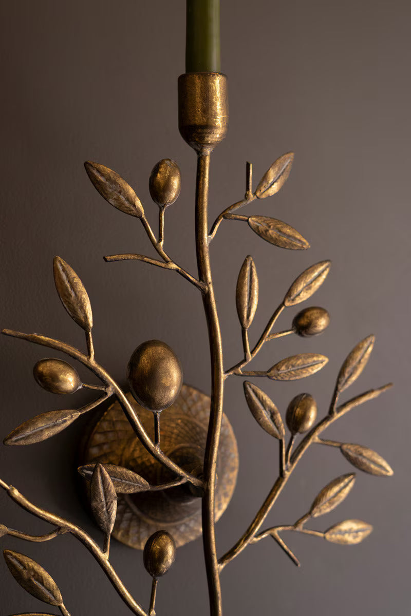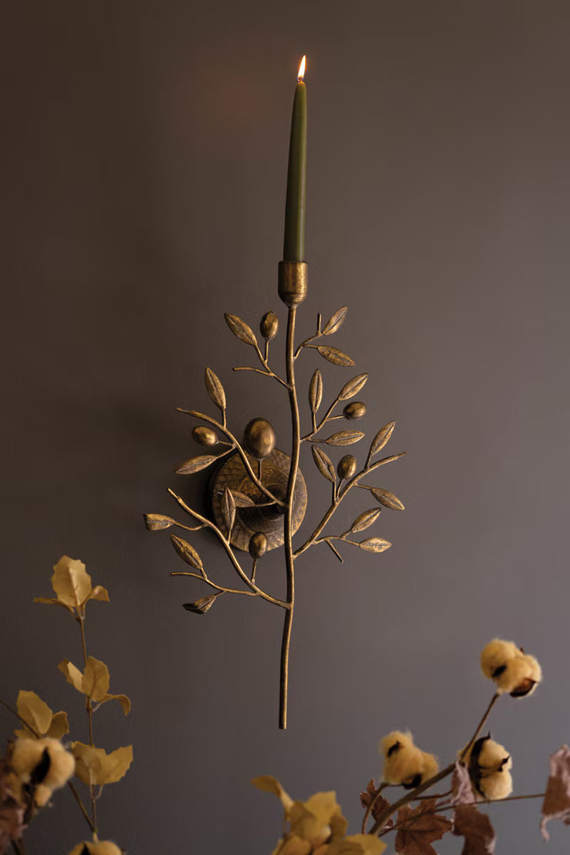 This fruit tree wall sconce brings gentle elegance to your walls. The sculpted branches hold a single taper candle, creating a warm glow framed by antique brass detailing. A beautiful way to add depth and character to hallways or intimate corners.