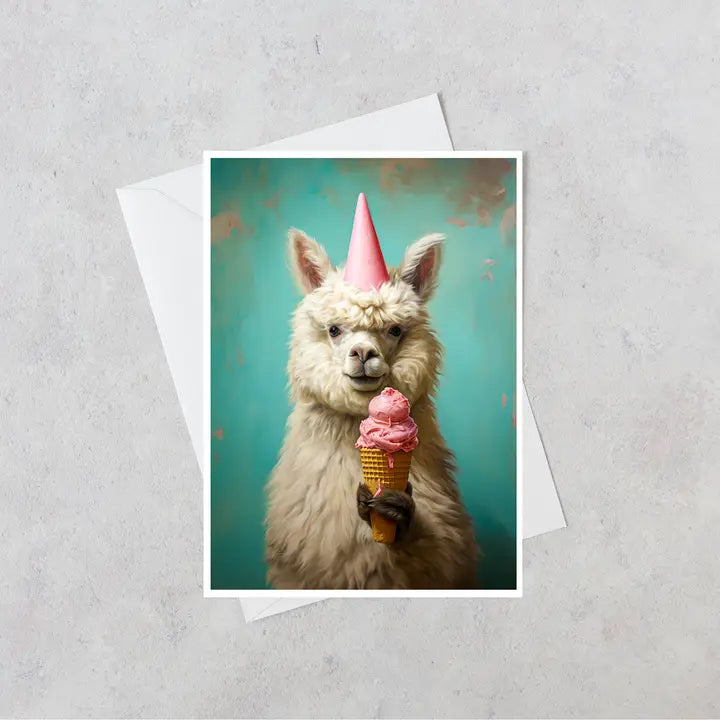 Make birthdays unforgettable with this whimsical note card showcasing an adorable llama sporting a festive pink party hat while enjoying a strawberry ice cream cone. The playful design captures pure celebration joy, perfect for spreading birthday cheer to friends and family. With a blank interior, you have complete freedom to pen your own heartfelt message. This charming card combines humor and warmth—ideal for anyone who loves quirky animal illustrations and festive fun.