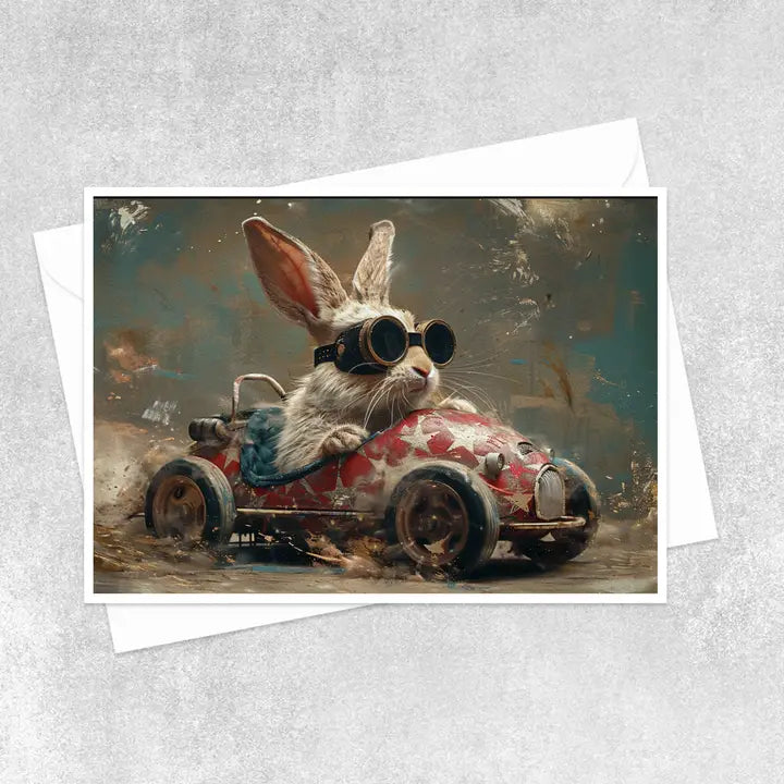 Meet Ricky "Roadster" Rabbit—the pint-sized speedster with retro goggles and a fearless racing spirit. Piloting his classic red car through worlds of imagination, Ricky embodies adventure and unstoppable momentum. Perfect for car enthusiasts, thrill-seekers, or anyone needing a boost of inspiration, this note card delivers your message with horsepower and heart. Ideal for birthdays, encouragement, or just-because moments that deserve a little extra dash of determination.