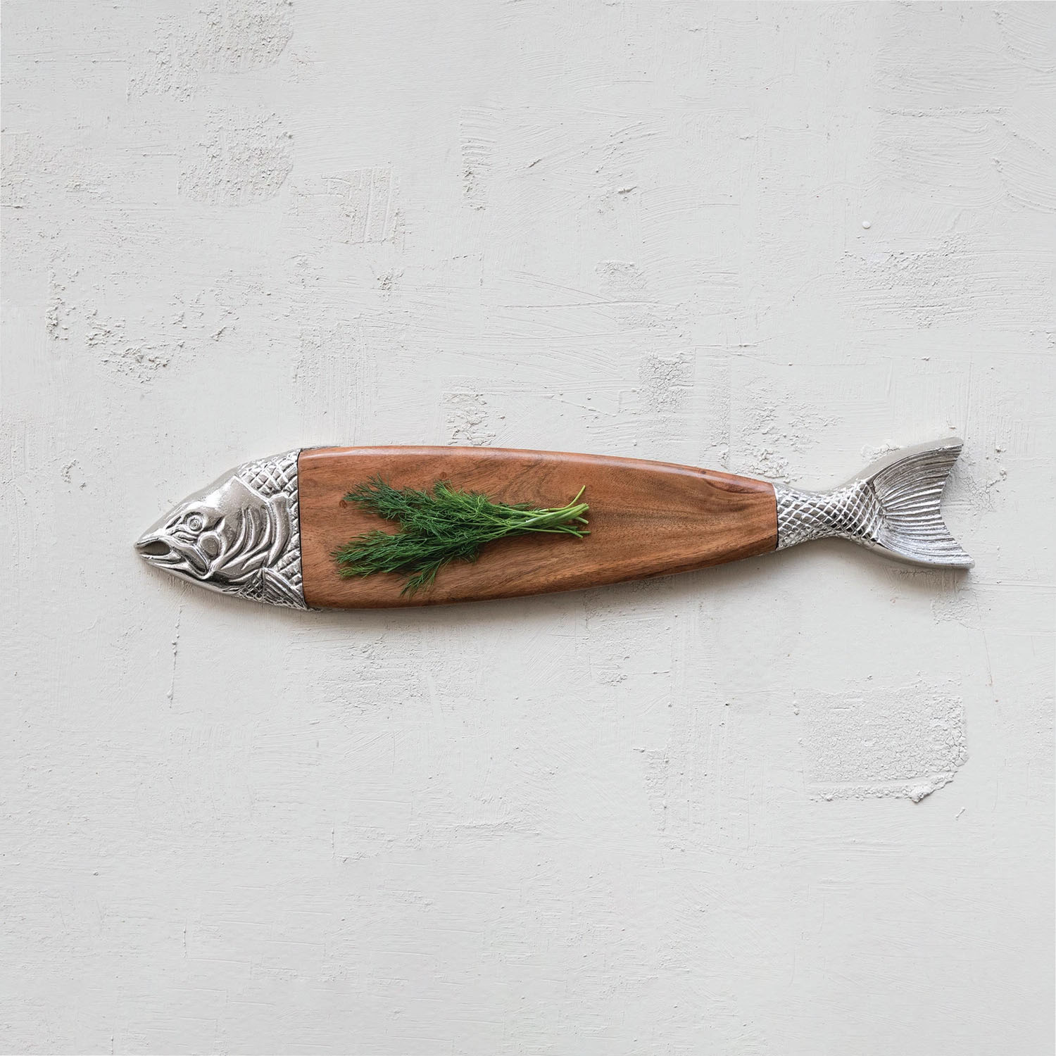 This striking 28" fish-shaped serving board combines warm acacia wood with sleek cast aluminum accents, creating an eye-catching centerpiece for any table. Perfect for entertaining, it offers generous space for cheese, charcuterie, appetizers, or desserts. The natural wood and nickel finish blend rustic charm with modern elegance, making it as beautiful displayed as it is functional. An impressive statement piece that elevates your hosting game.