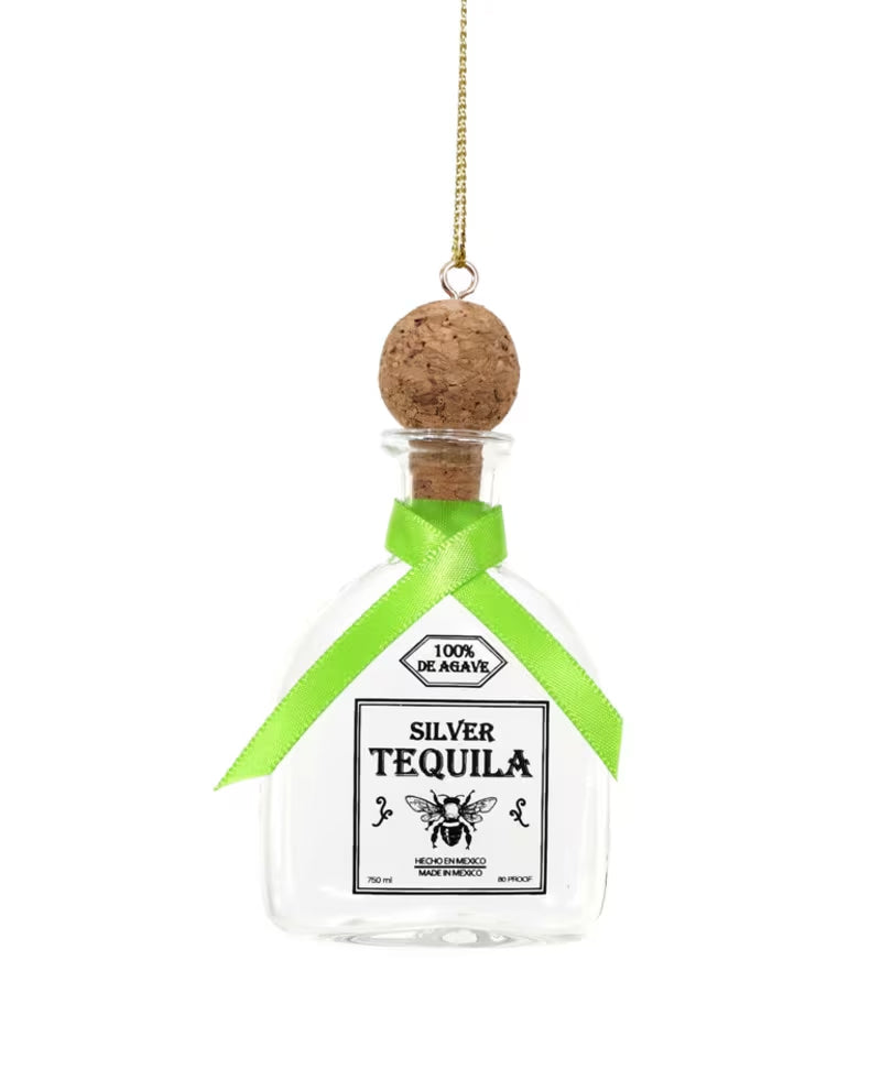 Elevate your holiday decor with this exquisite Cody Foster Glass Tequila Bottle Ornament. Crafted with luxurious attention to detail, each miniature bottle is a stunning replica of the real thing. Perfect for adding a touch of sophistication to your tree or making a unique statement tied onto a gift. Cheers to a festive and stylish season!