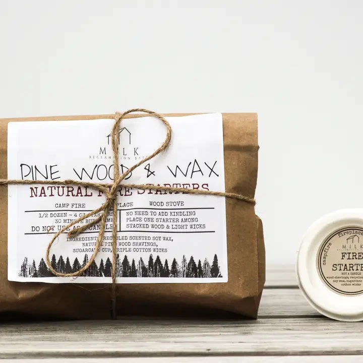 The Natural Fire Starters are made using recycled soy candle wax, pine shavings, and recycled cotton wicks. Simply place one of the fire starters under stacked wood and light the three wicks, no kindling needed!