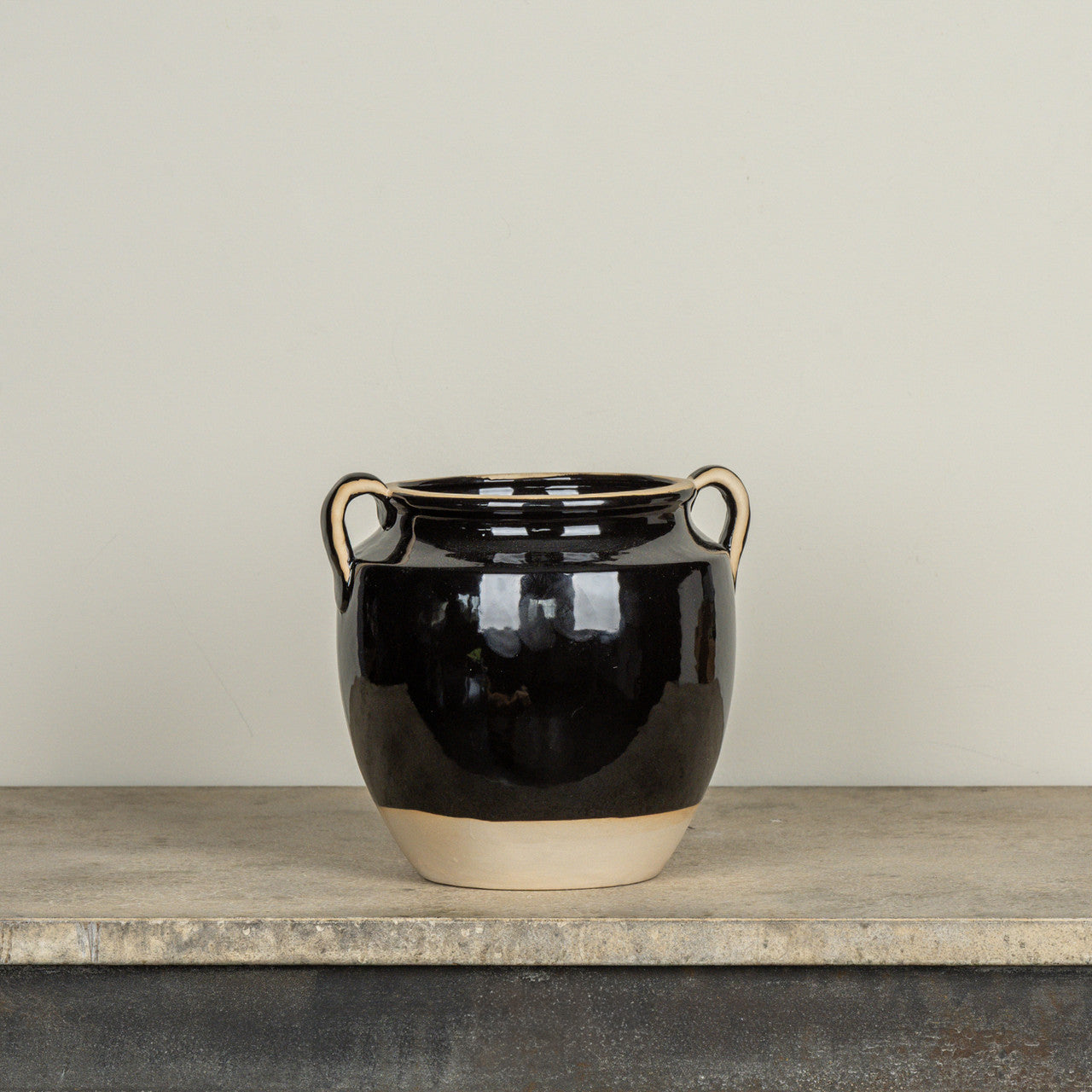 This striking black and tan double handled ceramic pot brings timeless vintage charm to any space. Its elegant two-tone design works beautifully as a standalone planter or repurposed vase for fresh or dried arrangements. Handcrafted details and classic styling make it a versatile décor piece that complements both modern and traditional interiors. Perfect for adding character to shelves, tables, or entryways.