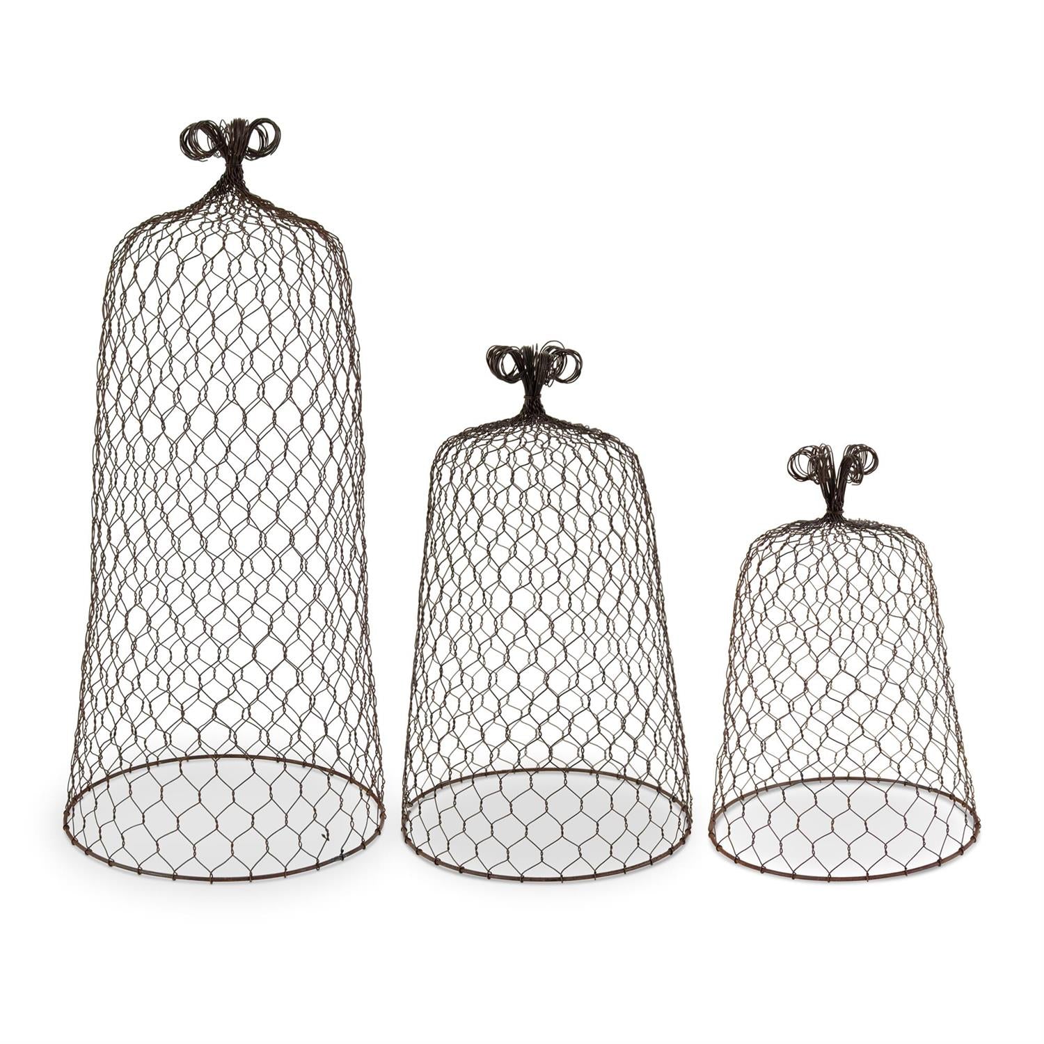Transform any space with timeless charm. This set of three rustic wire cloches brings vintage garden elegance indoors, perfect for showcasing seasonal displays, treasured book collections, potted plants, and cherished décor. Stack them, layer them, or arrange individually—each piece adds character and sophistication to shelves, tables, and mantels. A versatile accent that captures the beauty of a countryside garden, right in your home.