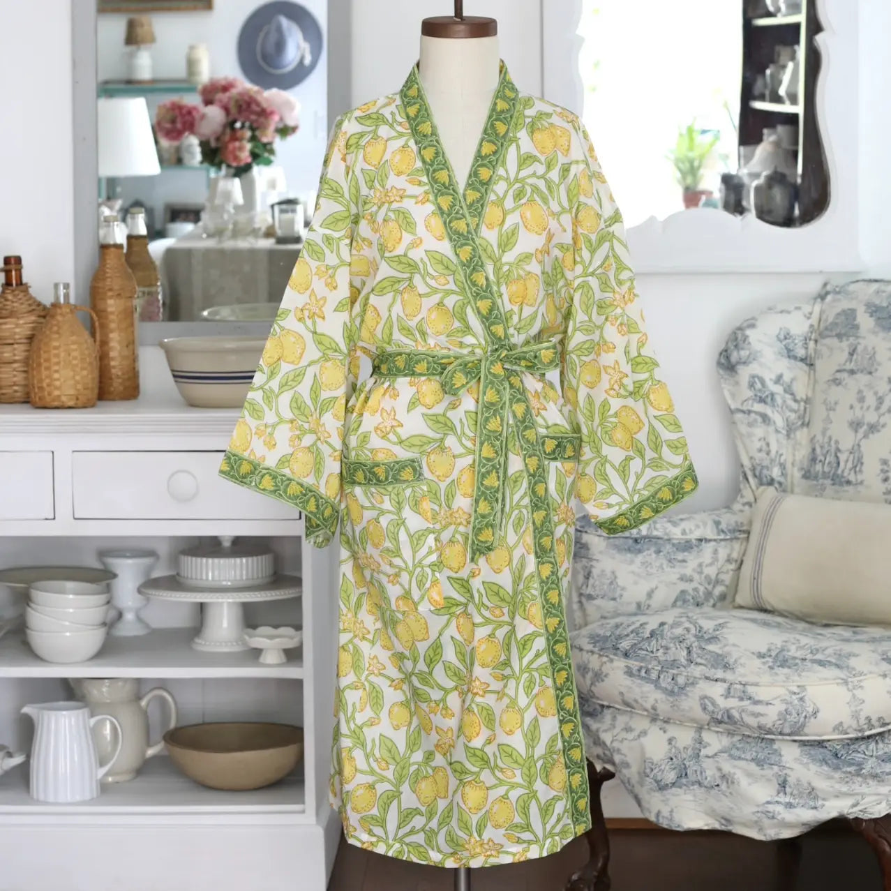 Wrap yourself in with the Lemon Print kimono robe, block printed by hand on soft, lightweight cotton voile. The swirling floral design in a sophisticated slate-gray hue on crisp white cotton makes this robe both airy and elegant—perfect for lounging at home or layering at the beach. Designed with wide sleeves, a relaxed fit, and contrasting trim on the sleeves, pockets, placket and belt, it offers effortless comfort with artisanal beauty.