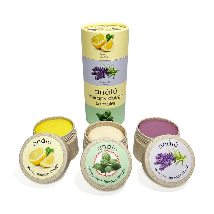 Our giftable canister contains 3 sample size jars of therapy dough: energizing lemon, calming lavender & invigorating peppermint. Made with plant-based ingredients and pure essential oils. Our jars contain wheat straw bioplastic, a byproduct of producing edible grains of wheat.