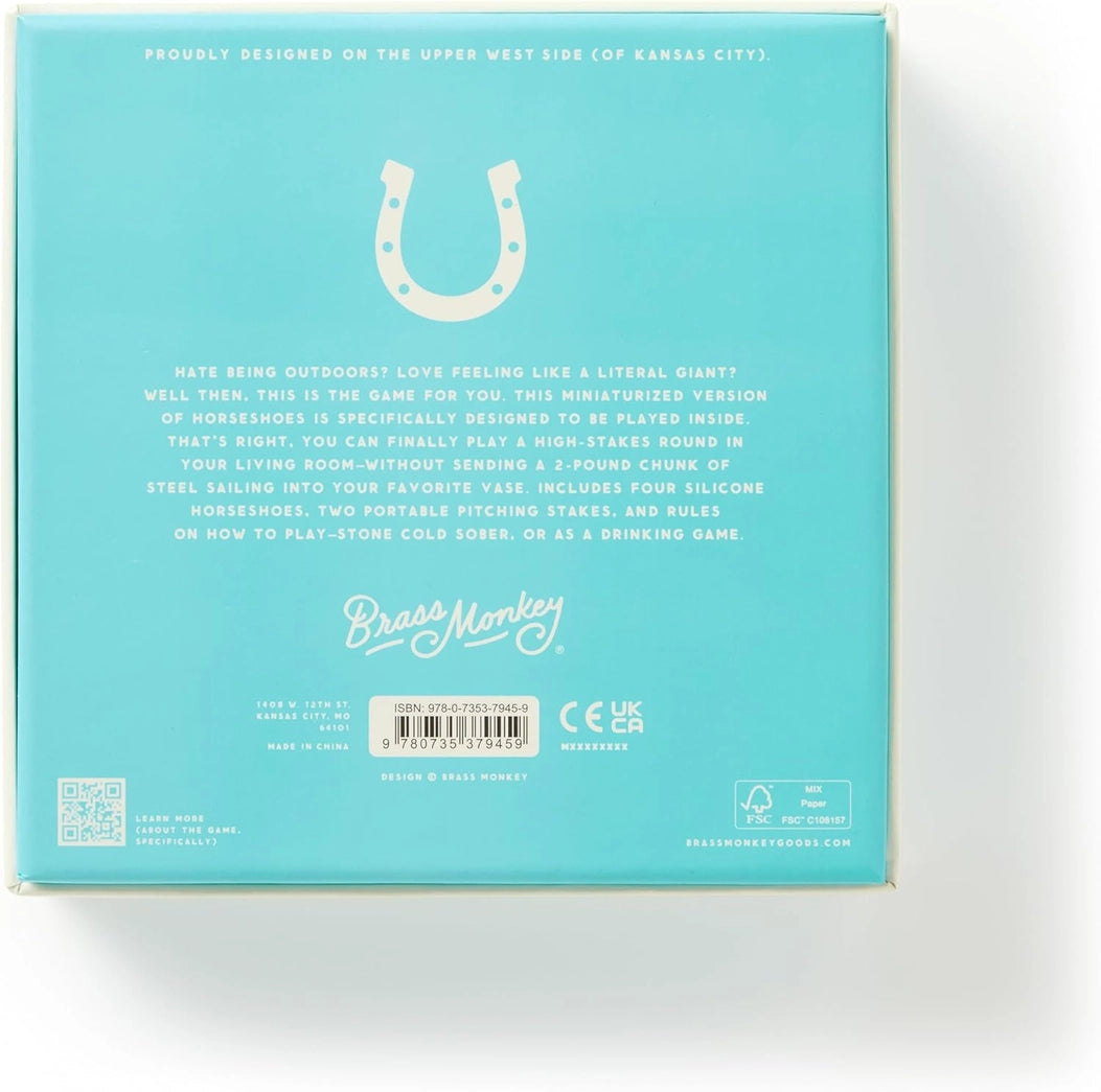 Giddy Up Tabletop Horseshoes Game by Brass Monkey brings the classic outdoor fun indoors, rain or shine. This compact version is perfectly sized for tabletops, delivering all the competitive excitement of traditional horseshoes without leaving your home. Ideal for game nights, parties, and gatherings, it transforms any indoor space into an entertainment hub. Whether the weather's keeping you inside or you're hosting an upscale event, this clever game keeps everyone engaged and entertained. Compact, stylish, and endlessly fun—the perfect way to play year-round.