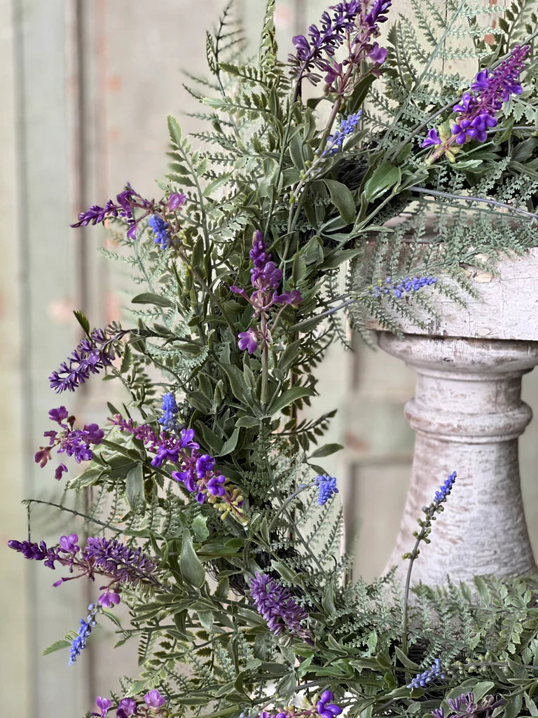 Bring the serene beauty of spring into your home with this stunning 24" Chastain Lavender Wreath. Vibrant lavender shoots burst with color against a soft backdrop of delicate greenery and cascading ferns, creating an effortlessly charming focal point for any room. Perfect for adding warmth and natural elegance to your entryway, living space, or seasonal décor, this wreath captures the peaceful essence of a blooming garden. Its generous size makes a bold statement while the soft, muted tones complement virtually any interior style. Transform your space with botanical beauty that brings joy and tranquility year-round.