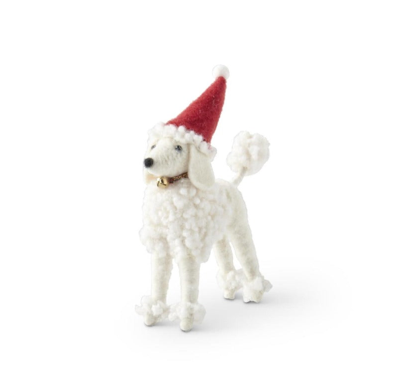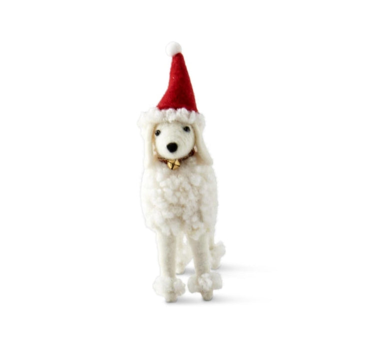Give your holiday décor a playful twist with this adorable Wool Christmas Poodle. Standing 6 inches tall, this fluffy white pup is handcrafted from soft wool and dressed for the season in a red Santa hat with a jingle bell collar. Its sweet details and cheerful personality make it a delightful addition to mantels, tabletops, or nestled among your holiday greenery.