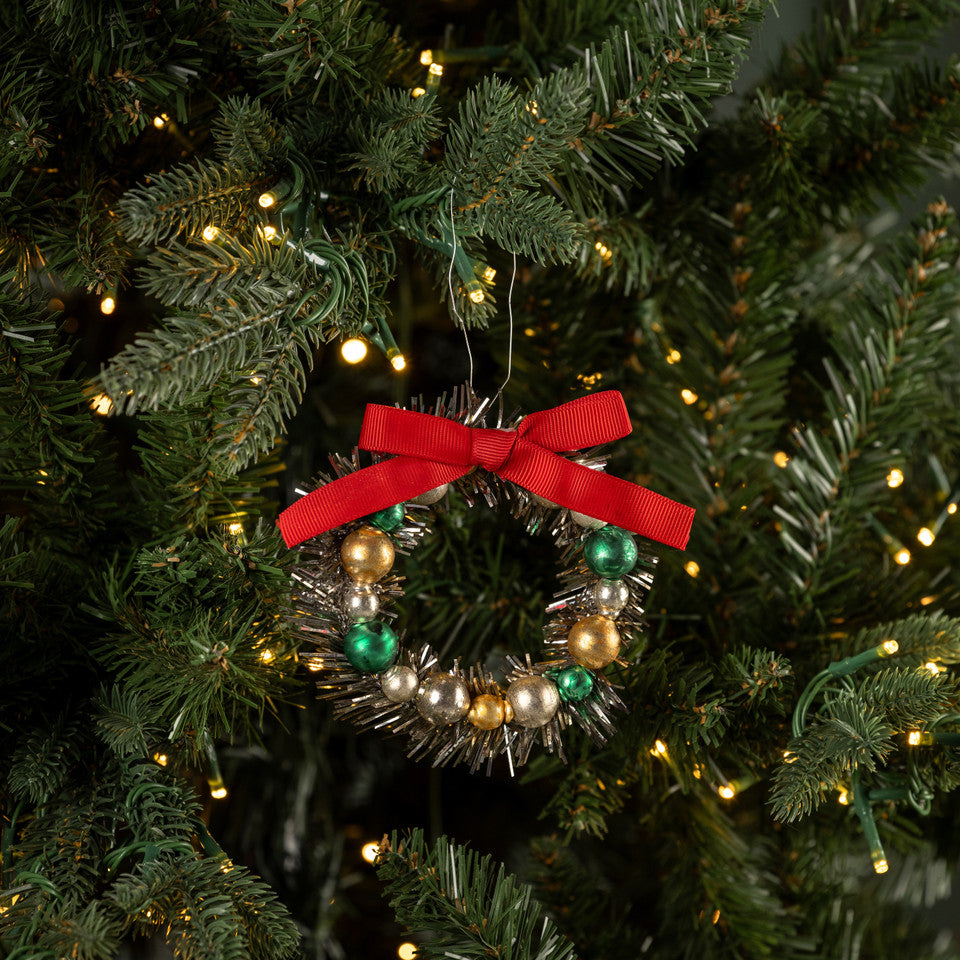 Add a playful vintage charm to your holiday with the Glass Beaded Tinsel Wreath Ornament. Perfect for hanging on your tree or tying onto a gift, this sparkling ornament brings a delightful touch of nostalgia and festive sparkle to any celebration.