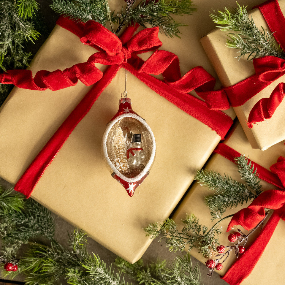 Celebrate the season with this playful Glass Snowman Diorama Ornament. Its vintage style makes it a charming addition to your tree or a delightful finishing touch when tied onto a gift, spreading festive cheer with a nostalgic sparkle.