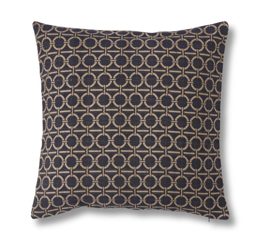 Elevate your space with the sophisticated charm of this Navy Ring Pillow. Featuring a classic interlocking circle pattern in warm taupe against a deep navy background, this pillow strikes the perfect balance between modern geometry and rustic texture. The thick, woven fabric adds tangible warmth and dimension, making it a standout accent piece that doesn't overwhelm the room.