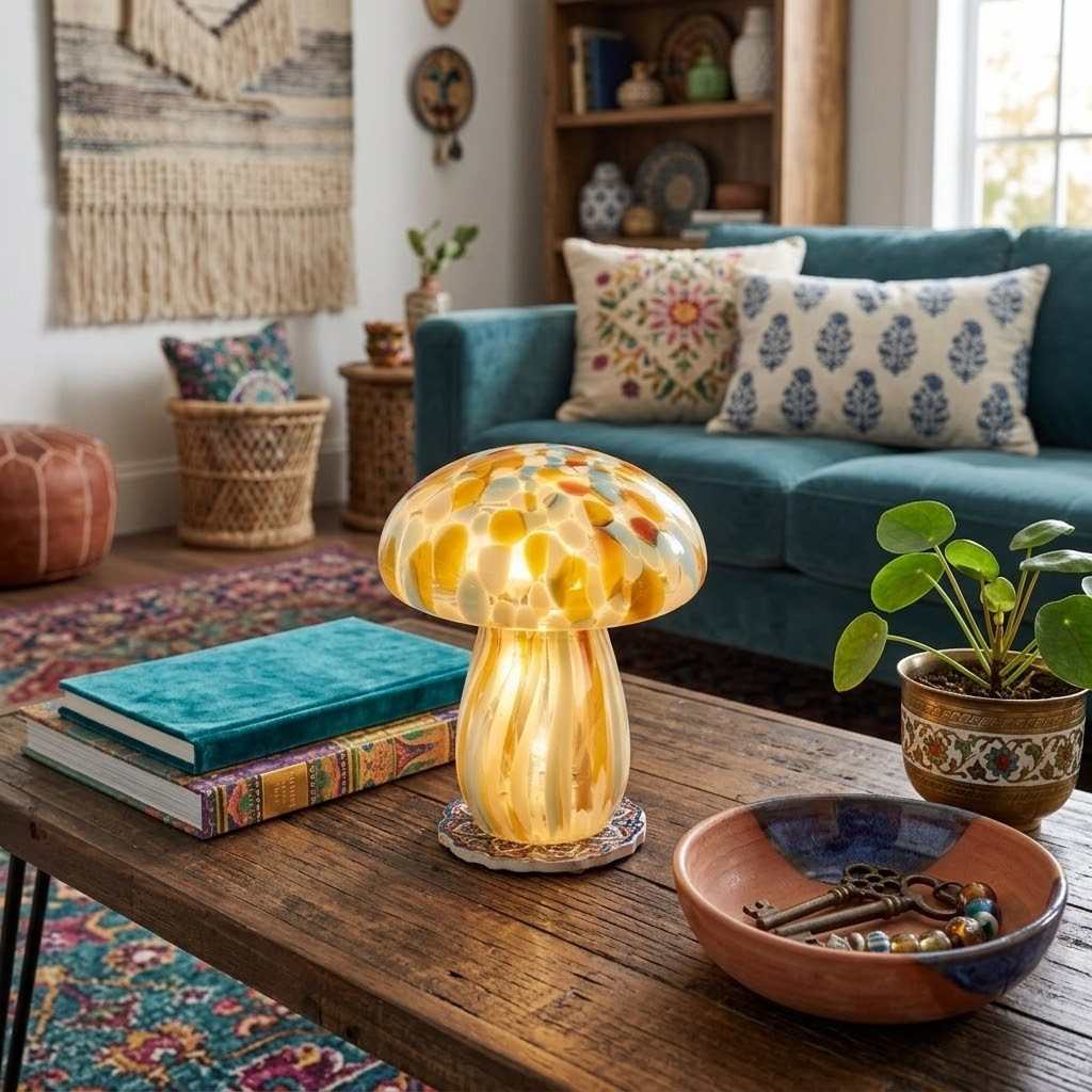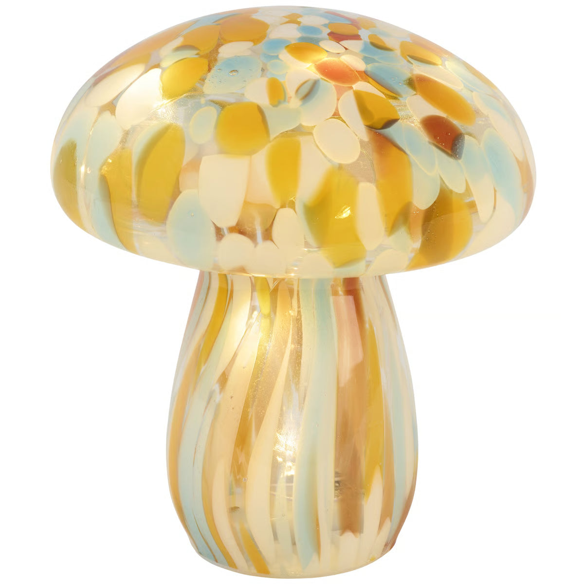 Add stylish mood lighting to any space with our lighted glass sitters featuring a mushroom inspired design for an earthy vibe. This lighted sitter displays a sculpted mushroom design in brown glass with colored swirl accents and wire lights inside. Our lighted Brown Swirl Mushroom includes a convenient 6-hour timer powered by 2 AAA batteries (not included).
