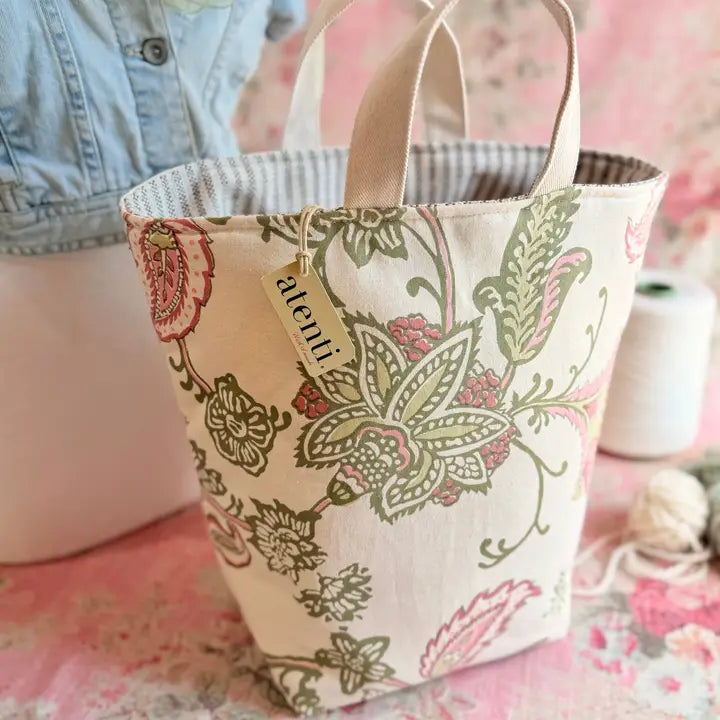 Meet your new favorite companion—the Rosalie Hope Basket! This charming project bag bursts with delicate florals in soft, romantic tones that'll make you smile every time you reach for it. Roll down the top for quick access to your supplies, spread it wide open thanks to the generous opening, and grab both handles for easy carrying. Inside, you'll discover three handy pockets and a fully lined interior in water-repellent tan taffeta that keeps everything protected. Whether you're hauling yarn, crafts, or everyday essentials, this roomy standalone beauty combines grace with serious functionality. Pure joy in basket form.