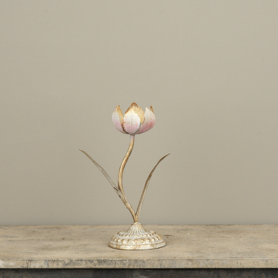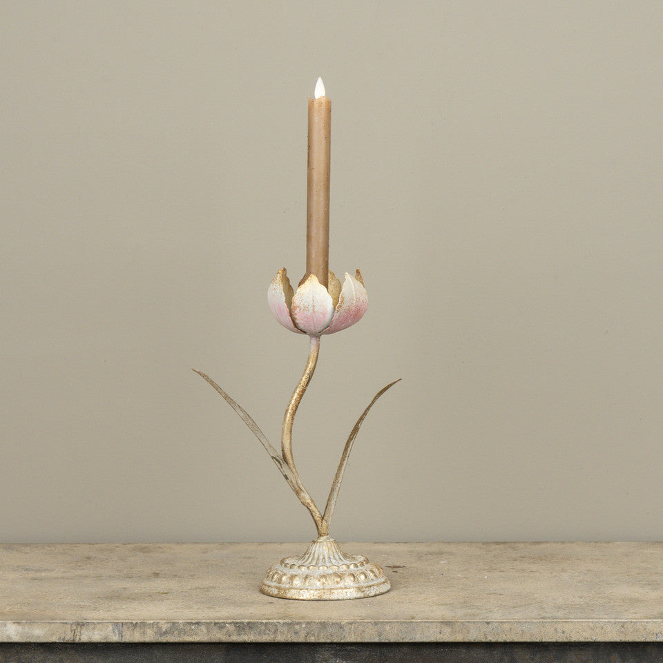 Bring cottage charm to any room with this weathered gold with a small touch of pink toleware flower taper candle holder. Its delicate metal toleware design adds a cottage aesthetic that complements farmhouse, vintage, and traditional décor styles. The graceful flower silhouette holds standard taper candles securely while creating a warm, inviting ambiance. Perfect for mantels, shelves, dining tables, or entryways. A timeless accent piece that blends functionality with understated elegance.