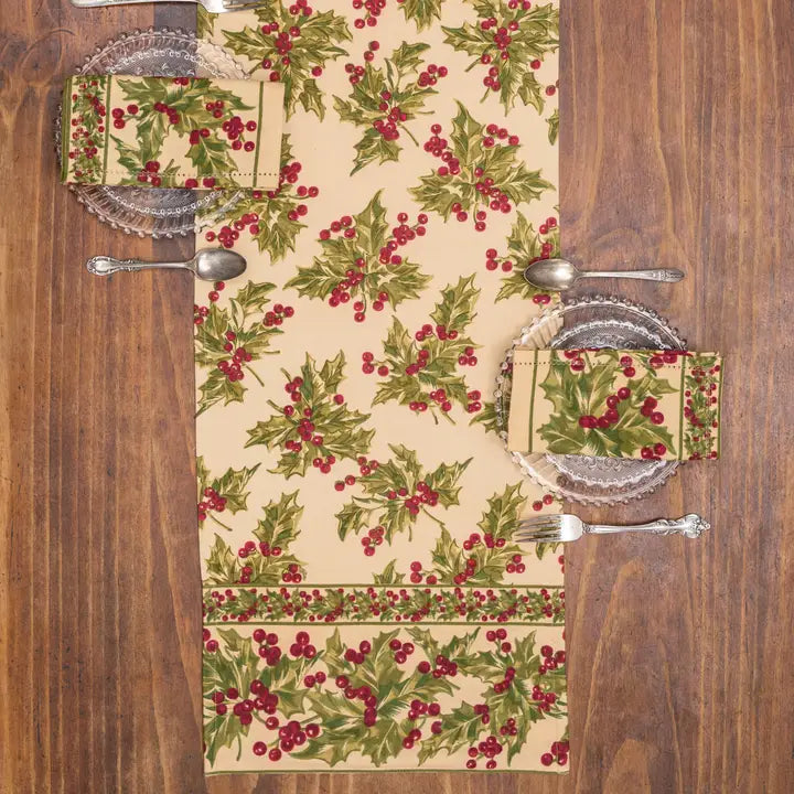 From April Cornell our 72" Winterberry Runner is a fleeting jewel of winter, the glorious winterberry appears for only a moment — tantalizing, bold, and beautiful. This exquisite runner captures that magic in textile form, with lush sprigs of holly and rich crimson berries unfurling across a warm neutral ground. Elegant, nostalgic, and warmly inviting, it’s the perfect foundation for holiday tablescapes, festive brunches, or quiet seasonal suppers by candlelight.