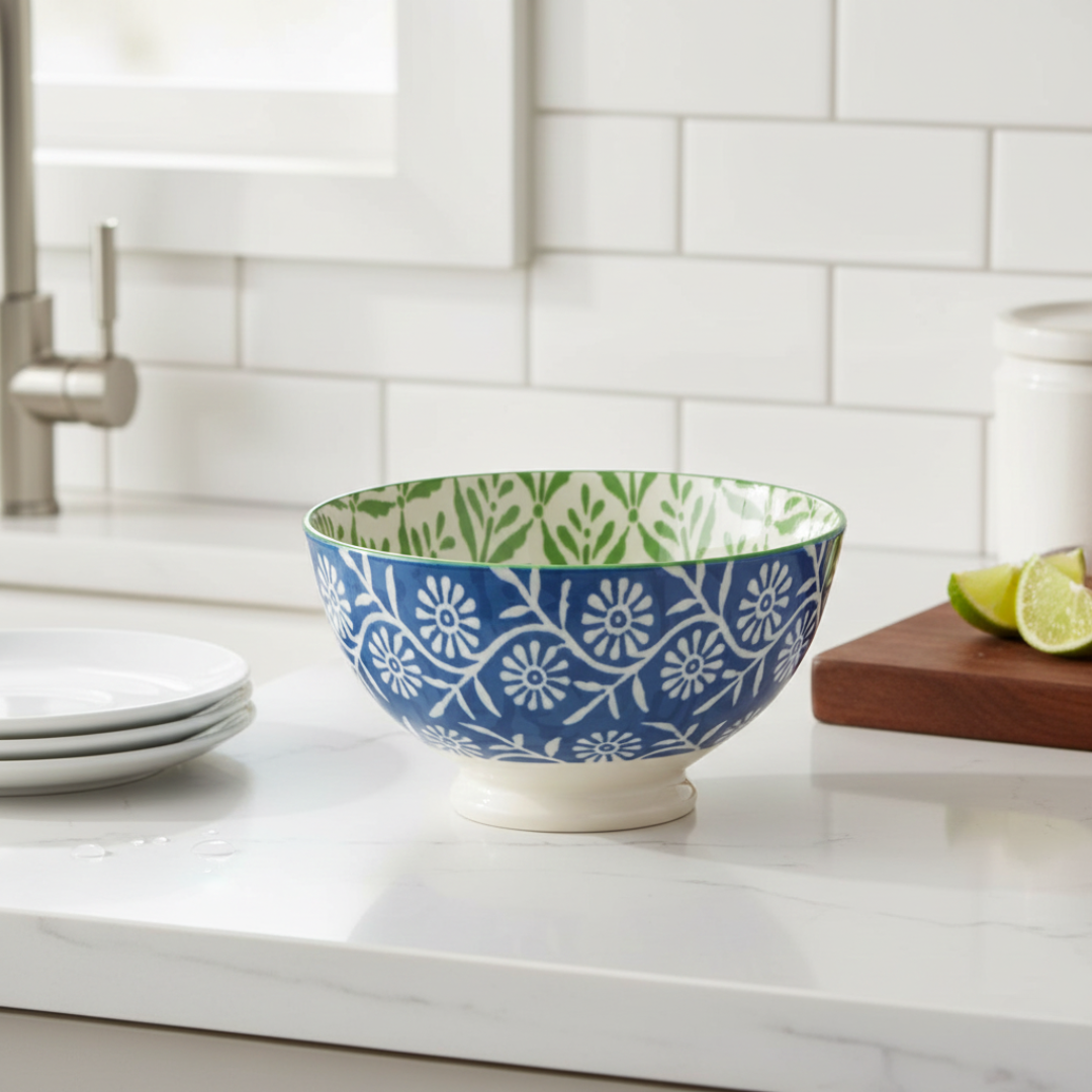 The eye-catching Green leaf 4" porcelain bowl with its contrasting pattern is stunning, as a collection or accent piece. The stamped design features a bold pattern while the embossed surface is a delight to the touch. The lively stamped and stenciled pattern that adorns this bowl makes it a thrill for the eye from any perspective.