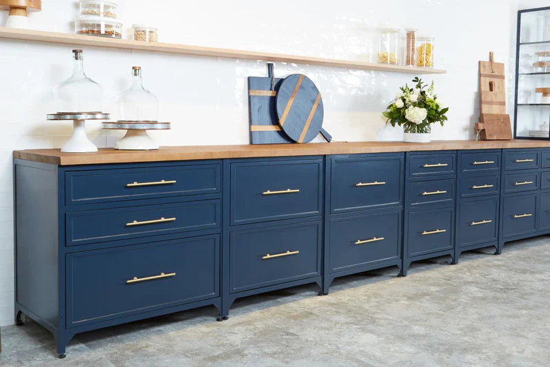 These reclaimed wood boards are distinguished by two strips of contrasting timber. For a modern spin, the serving board boasts a navy 100% plant-based, food-safe wax finish and the slats have maintained their exquisite organic beauty. Ideal for use as a charcuterie plate, showcasing bread, cheese or fruit, this board can also be used as a decorative kitchen accent.