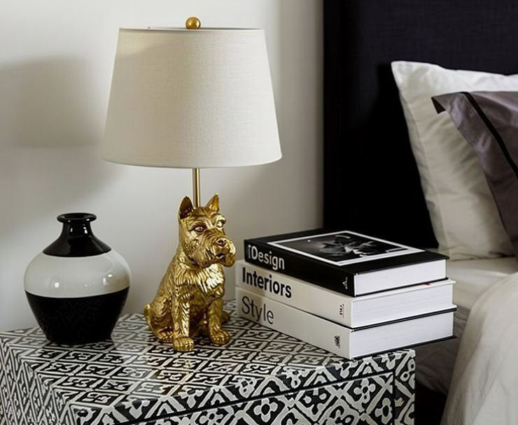 This charming Scottie-shaped table lamp brings vintage elegance to any space. Crafted in antique gold with a convenient inline switch, it delivers warm, inviting light while doubling as a decorative statement piece. Perfect for living rooms, bedrooms, or offices, its distinctive design complements various décor styles and sparks conversation. Add timeless character to your home with this stylish, functional accent lamp.