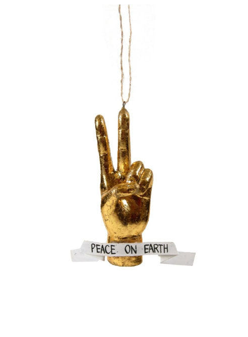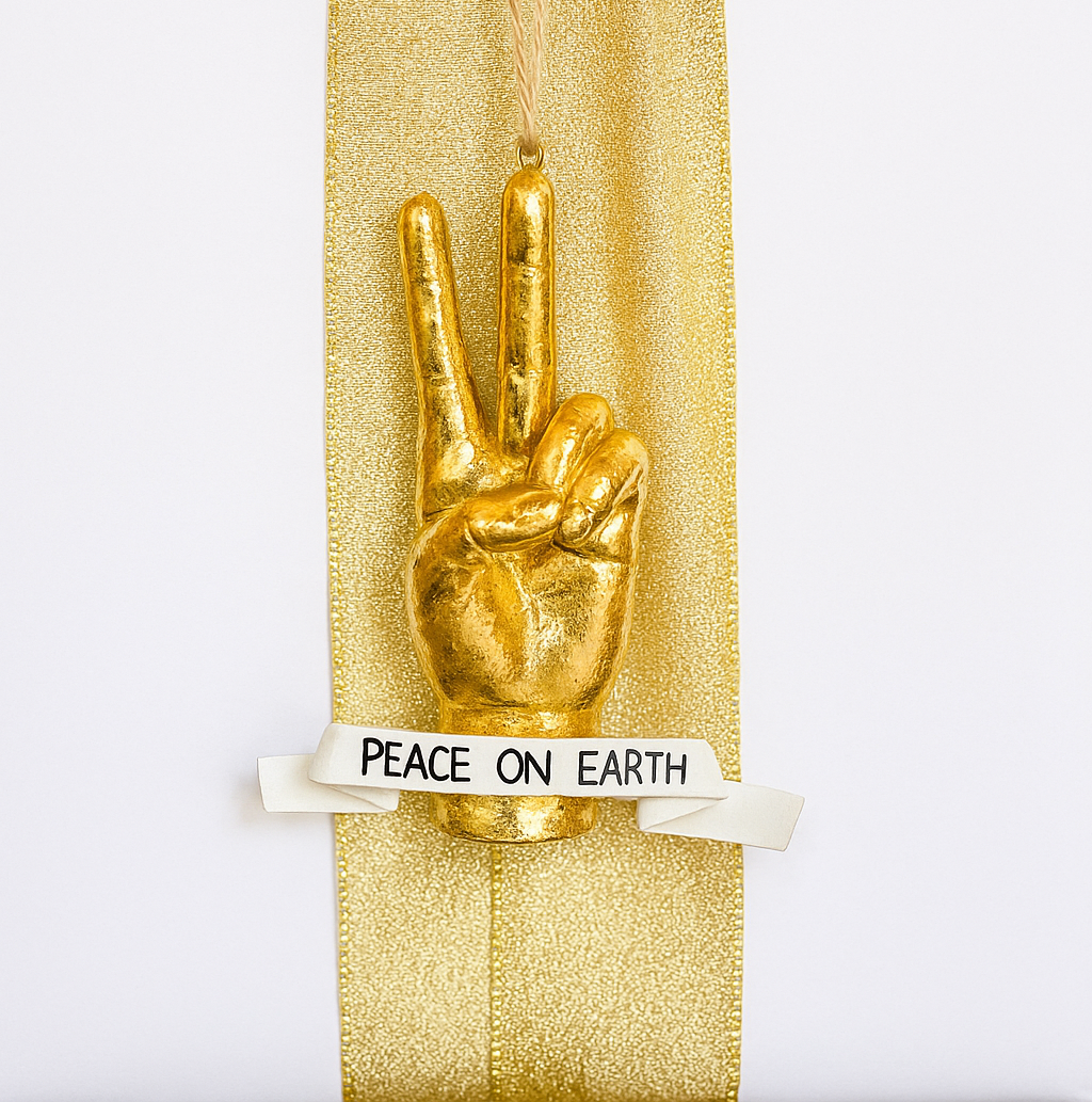 Celebrate peace with the Cody Foster Peace on Earth Ornament, a beautifully crafted gold hand-shaped decoration featuring a timeless peace symbol. This elegant piece makes a thoughtful gift and adds a meaningful touch to your holiday tree. Its refined design blends effortlessly with any décor, spreading a message of harmony throughout the season. Perfect for those who cherish symbols of hope and goodwill.