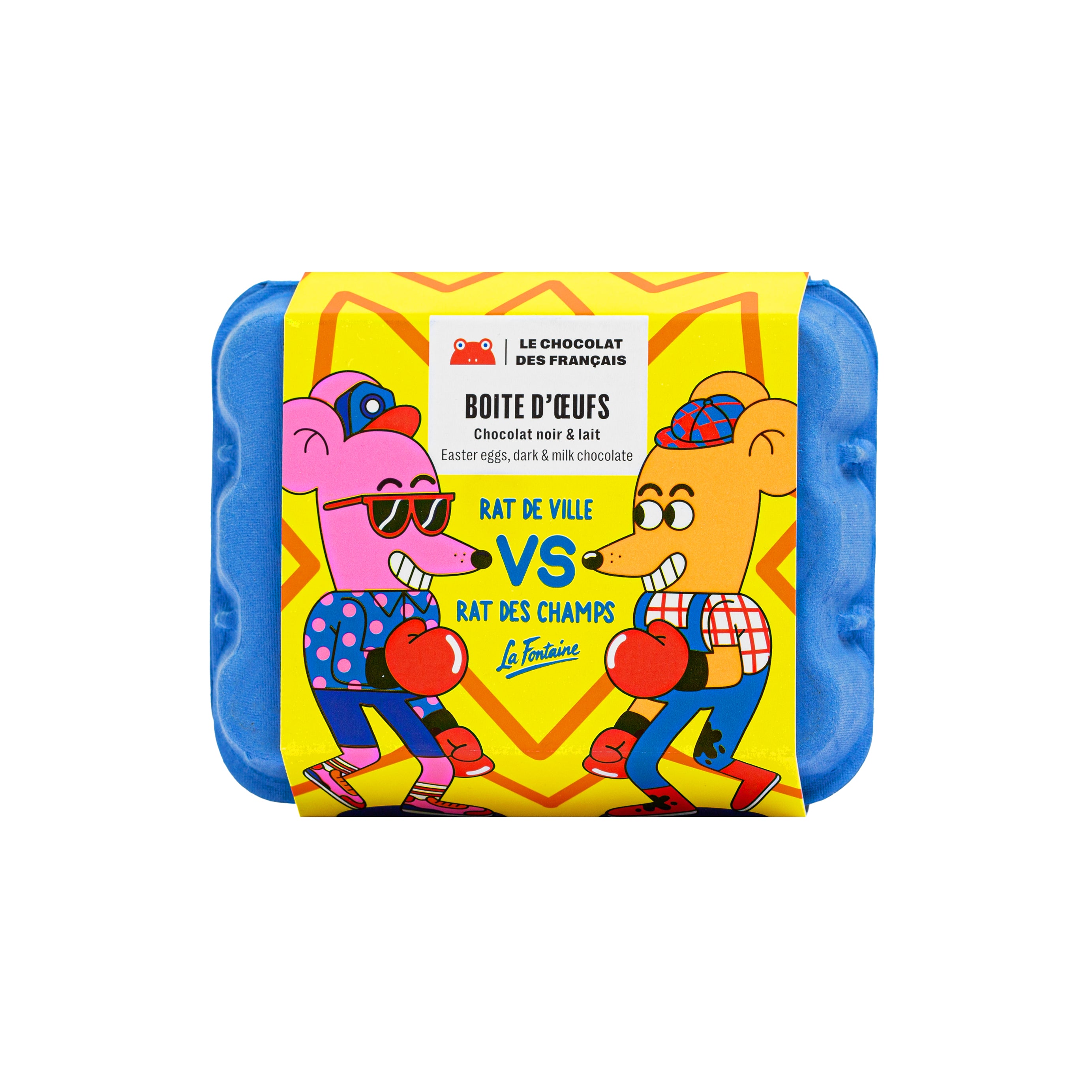 own Mouse or Country Mouse? We’ll let you discover this fable by Jean de La Fontaine and choose your side! This box of Easter eggs features four delicious recipes: milk chocolate with almond praline, milk chocolate gianduja, dark chocolate praline, and crunchy dark chocolate gianduja. Enough to delight every sweet tooth!