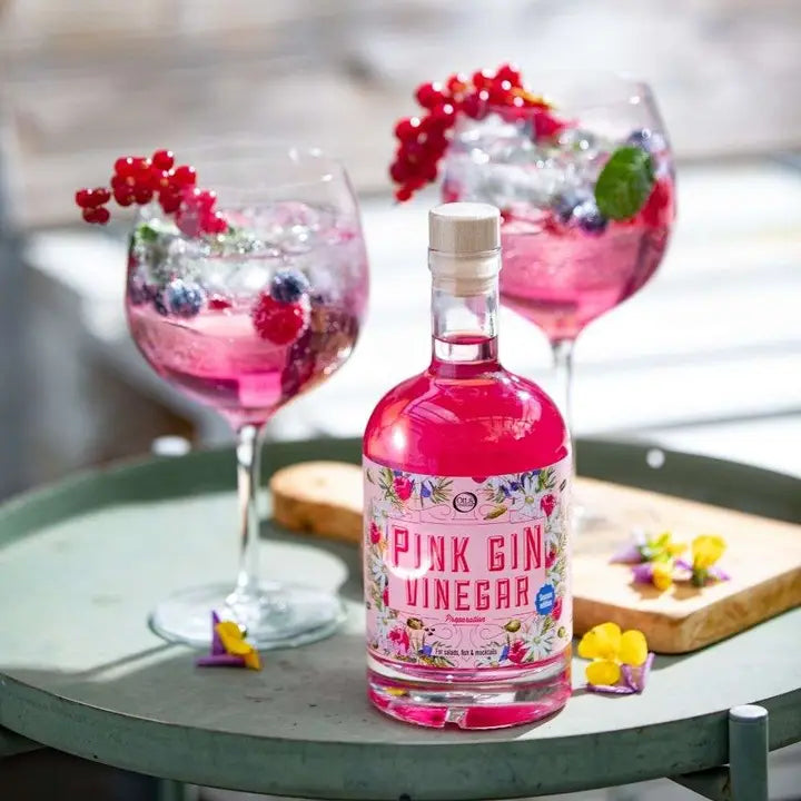 This unique vinegar has the fresh taste of rosé gin but without alcohol. It's delicious in salads, with fish and you can even make (non-alcoholic) cocktails. Combine with tonic or prosecco and finish off with some fresh raspberries and mint. So simple and easy to create a unique, tasty drink in no time! The aroma is a combination of botanical gin herbs (cardamom, juniper, fennel, and star anise) and the taste is sweet and fruity with a subtle tartness thanks to the raspberries.