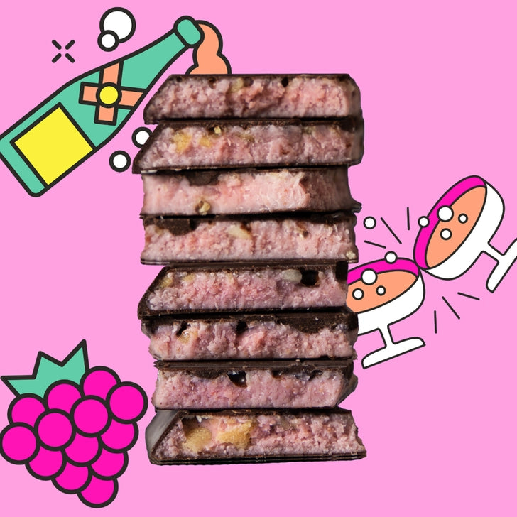 Pop! Fizz! Yum! This bar is ready for celebrating. Crafted using a dark chocolate shell and freeze-dried raspberries in white chocolate, it also adds all natural popping candy that tickle the palate like champagne bubbles. Non alcoholic. Art design by Ali Mac.