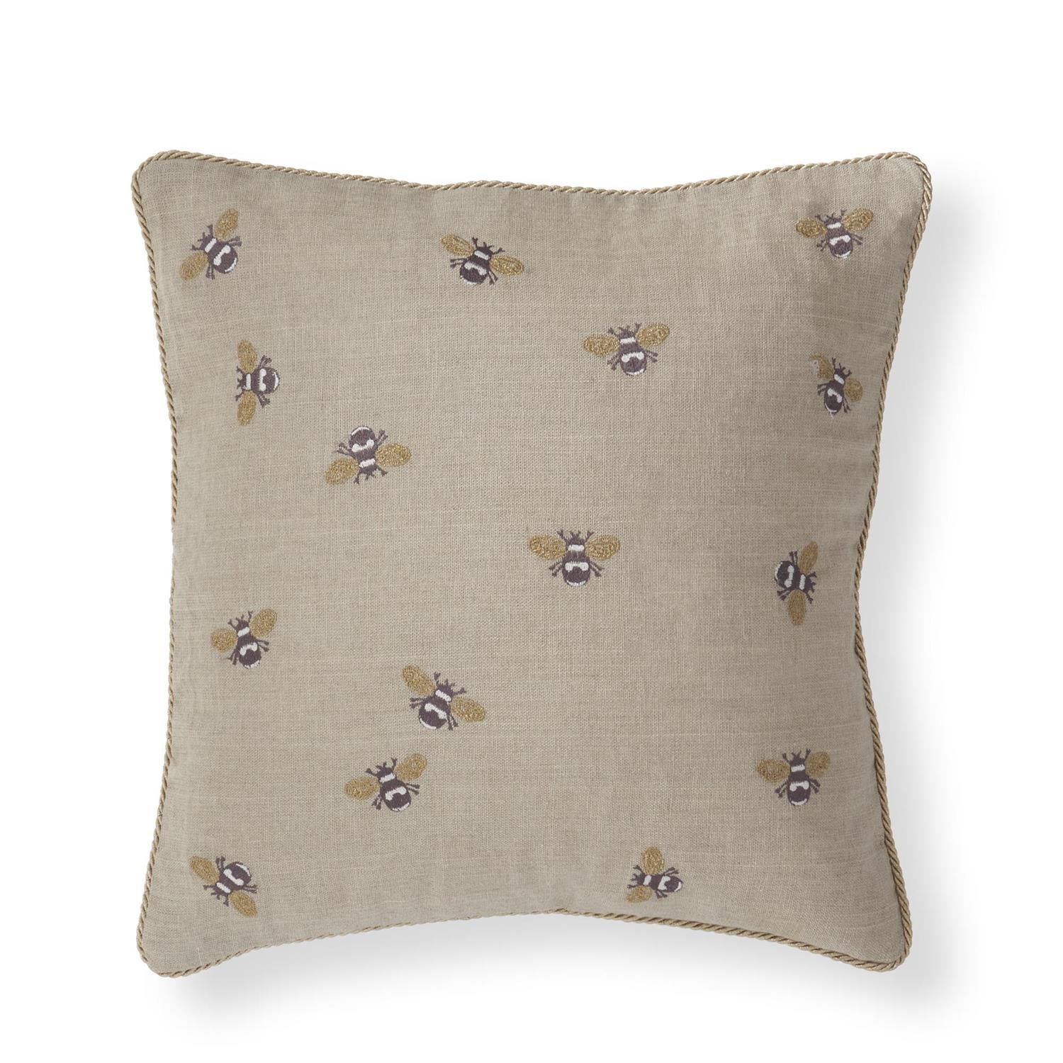 18" Beige Linen with Gold Piping Bees Embroidered Pillow