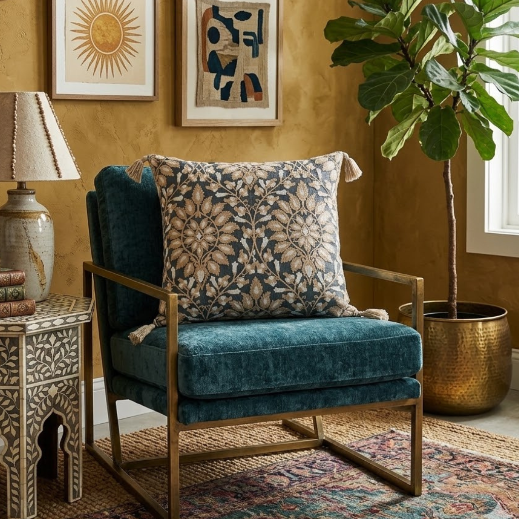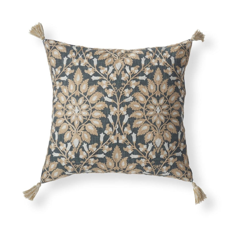 Bring a touch of artisan charm to your space with this stunning handcrafted statement piece. Intricately embroidered with a sweeping botanical pattern in warm taupe and soft cream against a deep, moody blue backdrop, this pillow feels like a rare vintage find. Finished with playful corner tassels for an extra layer of texture..