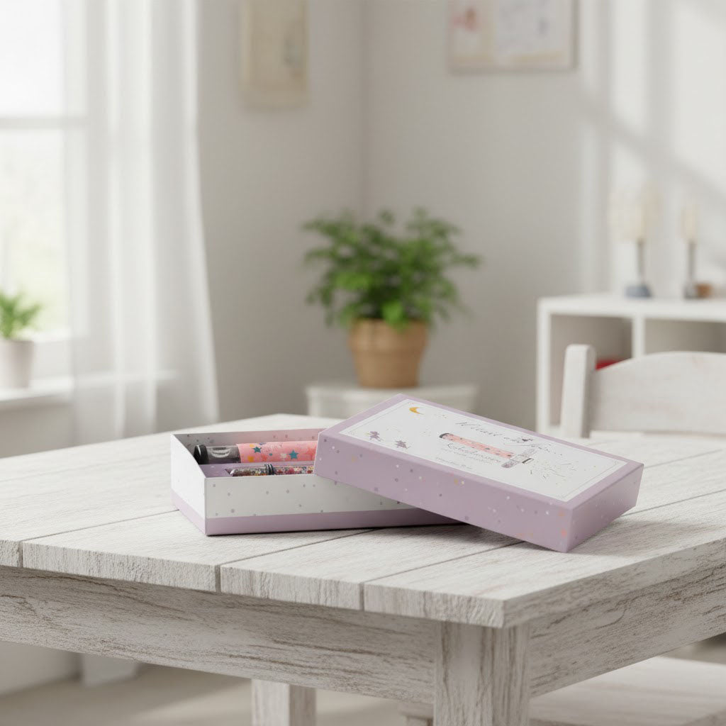 Immerse yourself in a world of wonder with our Once Upon A Time Kaleidoscope Set. This enchanting gift box features two glitter kaleidoscopes that reveal mesmerizing checkered, floral, and diamond patterns. Watch in awe as the magnifying glass and small mirrors create infinite expansions of light and color. Turn the kaleidoscope to unlock endless combinations of dazzling shapes and brilliant hues—a captivating recreational activity that transforms ordinary moments into magical experiences.