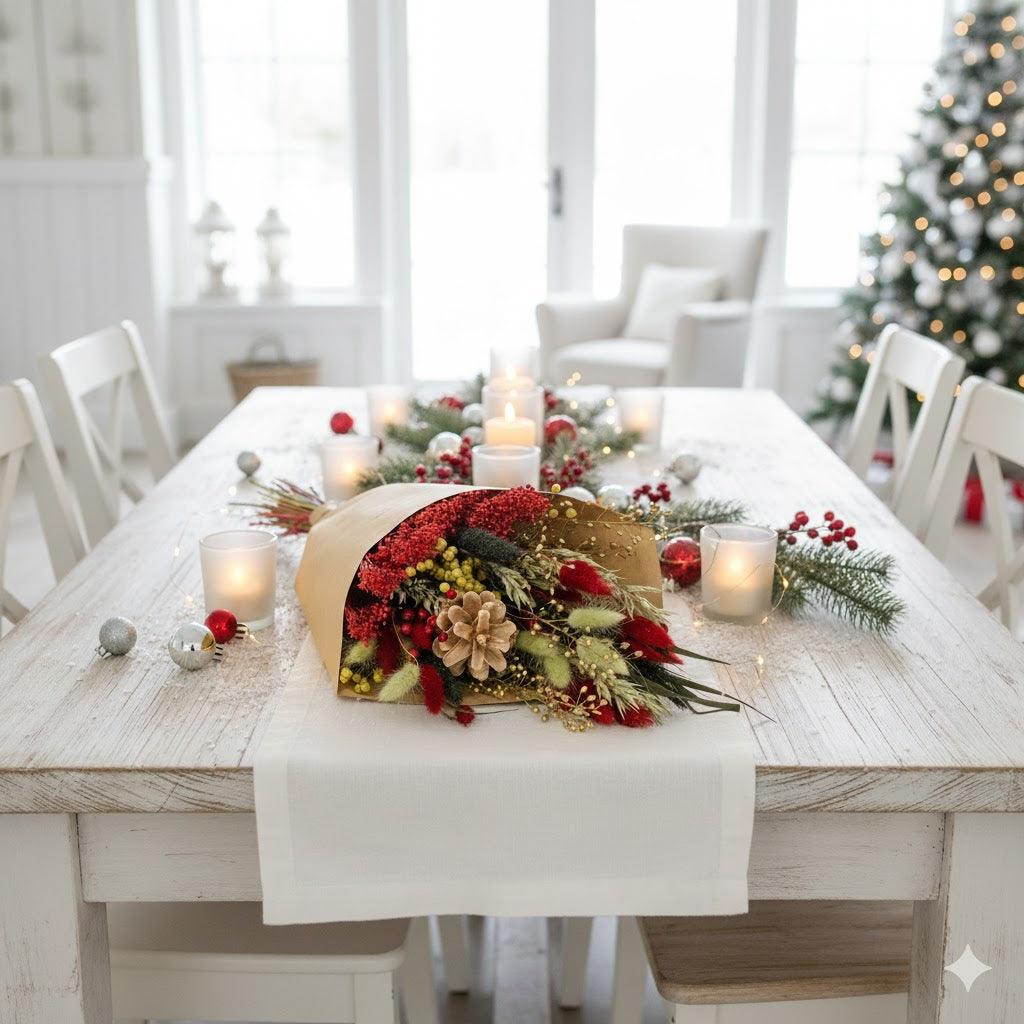 Bring warmth and elegance to any holiday gathering with this stunning Dried Market Flowers Bunch. Bursting with rich, festive tones and natural textures, it's the perfect hostess gift that shows thoughtfulness without requiring a vase or maintenance. These preserved blooms capture the spirit of the season and make an impressive statement on any table or mantel. Ideal for someone who appreciates timeless beauty and botanical charm, this arrangement delivers holiday cheer that lasts long after the celebrations end.