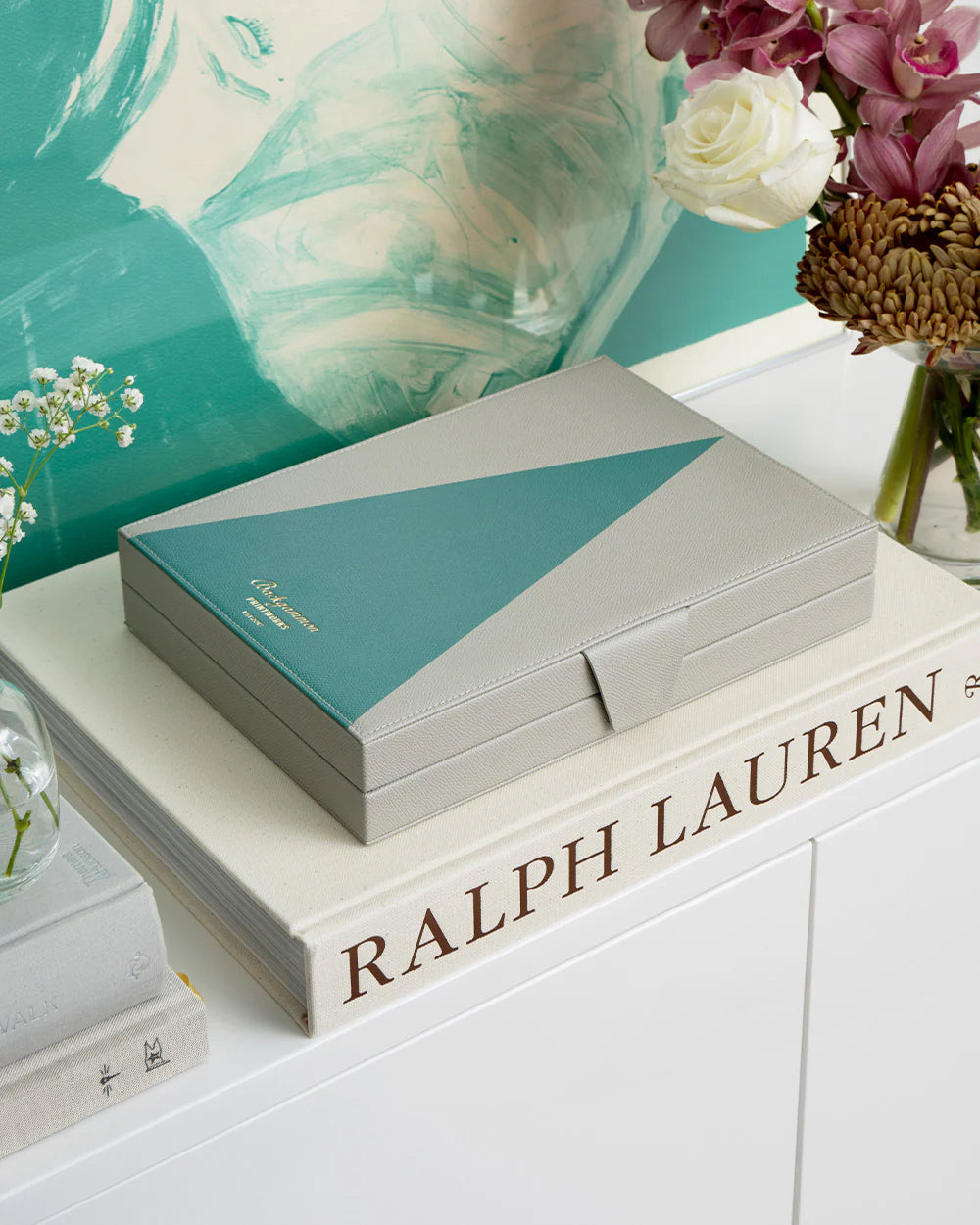 Reverra Backgammon brings timeless strategy to your home in sophisticated style. Wrapped in smooth faux leather with refined detailing, this contemporary take on a classic opens to reveal a beautifully designed playing field in harmonious tones. Perfect for both serious play and elegant display, it includes multilingual instructions in English, French, and German. Where craftsmanship meets gameplay.