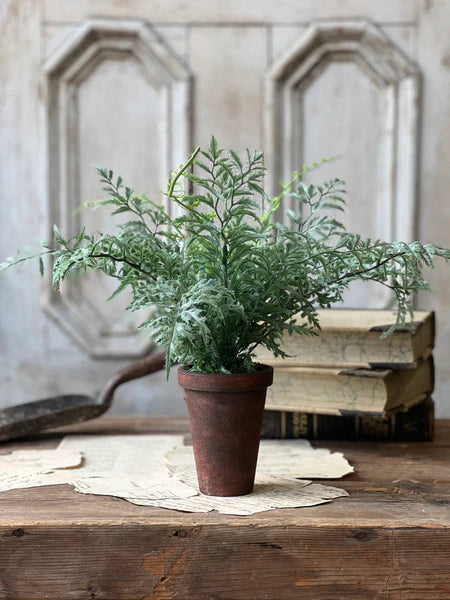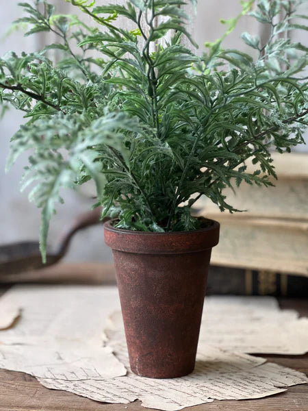 Bring living elegance into any room with the 14" Foundry Potted Fern. This striking botanical accent features delicate, lifelike greenery with a subtle powdered finish that catches the light beautifully. The fern rises gracefully from a distinctively textured, slender pot that complements modern and traditional décor alike. Perfect for shelves, desks, or side tables, this potted fern adds an instant refresh of natural beauty without the maintenance demands of live plants.