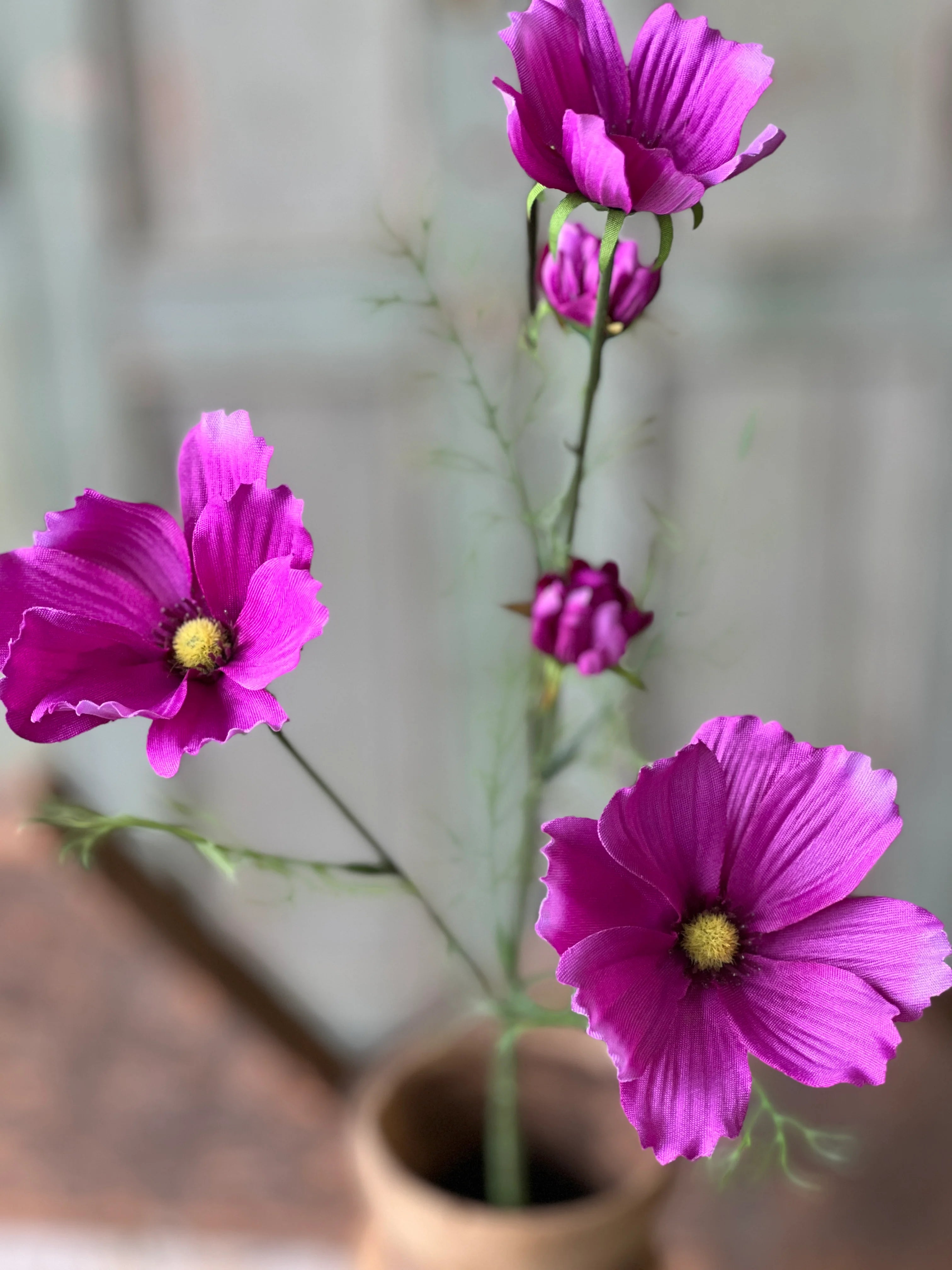 Elevate your space with the 24" Cockle Cosmos Stem. Its cheerful blooms and airy foliage bring a touch of cut flower garden charm, adding pops of color and pizazz. The perfect way to brighten any room and spark joy.