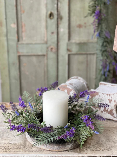 Bring the serene beauty of spring into your home with this enchanting lavender candle ring. Featuring vibrant lavender shoots nestled among soft-toned greenery and delicate ferns, this 16" ring creates an instantly charming focal point around any pillar candle. The 6" inner diameter fits standard candles perfectly, while the lush botanical design adds natural elegance to your décor. Transform your space into a tranquil garden retreat that invites relaxation and warmth.