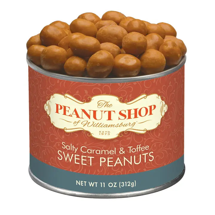 Savor the exquisite taste of our 11 oz. Salted Caramel Toffee Peanuts from The Peanut Shop of Williamsburg. Following a 47-year old tradition, we hand roast the finest 'cream of the crop' super extra-large peanuts in small batches. Drenched in a delectable salted caramel toffee, each bite offers a delightful crunch and a burst of flavor. These peanuts are not just delicious, but also meet the highest market-grade standards, something only 3% of all Virginia Peanuts can claim. Enjoy as a snack or send as a gift to your loved ones!