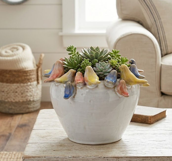 Elevate your spring decor with our Birds On The Rim Planter. The delicate, pastel-colored birds add a touch of elegance and freshness to any room. Fill it with your favorite plant, real or faux, for a charming and sophisticated display.