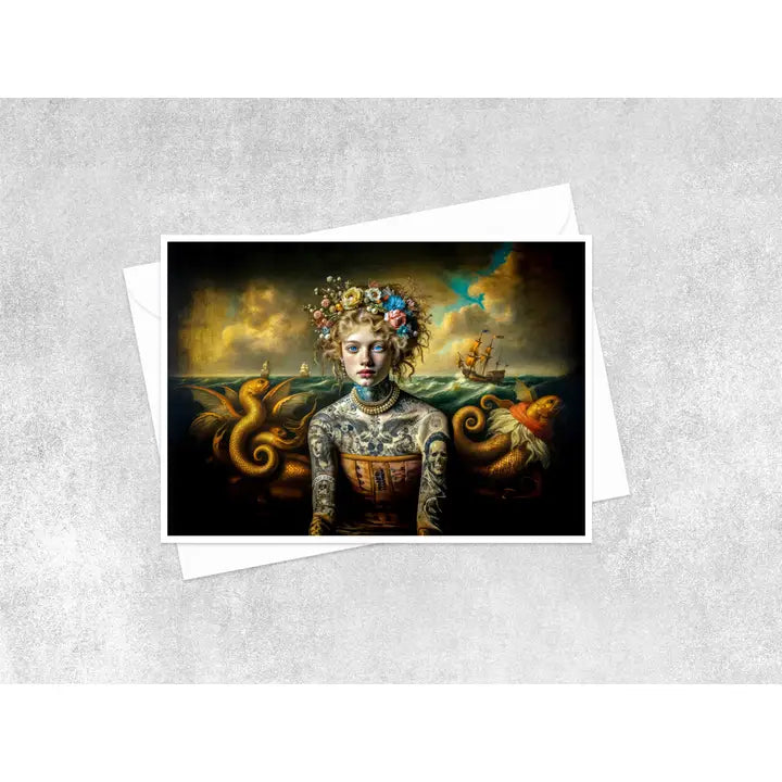 Dive into whimsy with this one-of-a-kind note card featuring a tattooed mermaid pulled straight from a vintage oil painting. Her inked scales and mysterious gaze bring an edgy, artistic flair to your correspondence. Perfect for the unconventional soul who appreciates bold imagery and nostalgic charm. Whether you're sending wishes or witty remarks, this card makes a splash with its distinctive character and vintage-inspired aesthetic. A conversation starter that proves mermaids aren't just mythical—they're rebellious.