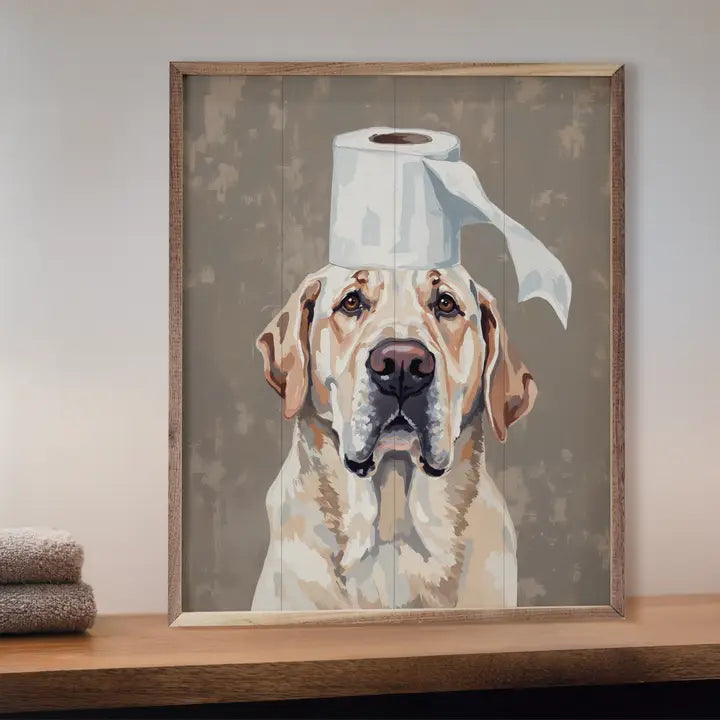 Bring a smile to your bathroom with this charming wall decor featuring a playful dog sporting a toilet paper roll. Each handcrafted sign is made in the USA and finished with our signature walnut frame for a polished, sophisticated look. Perfect for powder rooms, guest baths, or master suites, this witty piece combines trending design with timeless appeal. Available in multiple sizes to fit any space, it's an easy-to-display accent that adds warmth, humor, and personality to your home.