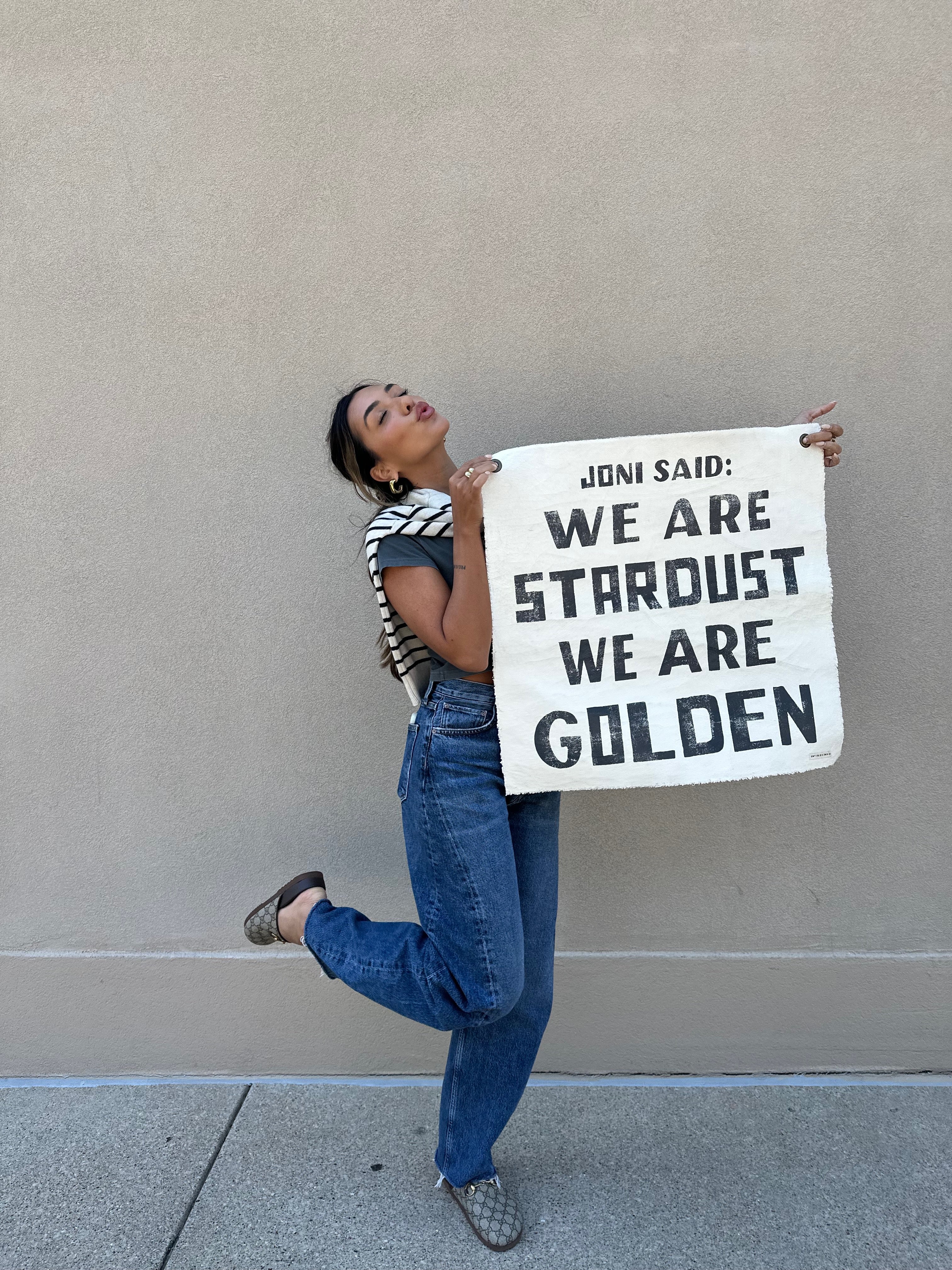 Embrace your uniqueness with our "We Are Stardust We Are Golden" wall hanging. Featuring the iconic quote from Joni Mitchell, this daily dose of inspiration will remind you to follow your dreams and stay true to yourself. Perfect for any space, let it infuse positivity and pep into your everyday life!