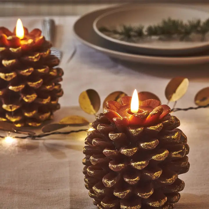 Transform your space with the enchanting glow of our LED Pinecone Candle with Gold Edge. This captivating décor piece delivers the warmth and ambiance of candlelight without the flame, perfect for creating a cozy atmosphere anywhere in your home. Featuring a soft warm white LED that casts an inviting glow, it's available in elegant White and Gold finishes to complement any style. Simply power it with two AA batteries (not included) for instant, hassle-free illumination. Whether displayed on a mantel, shelf, or table, this charming candle brings festive warmth and timeless elegance to your indoor spaces.