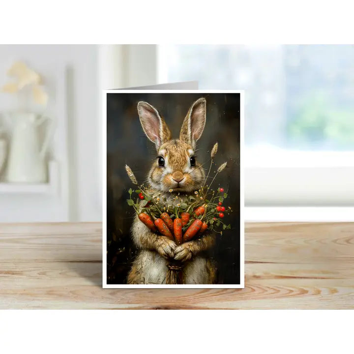 A bunny’s bountiful harvest! This adorable rabbit beams with pride, cradling a freshly gathered bouquet of carrots, berries, and wildflowers. The earthy tones and warm lighting make this card a delightful choice for nature lovers, gardeners, or anyone who appreciates the simple joys of life. Perfect for Easter, thank-you notes, or sending a rustic “thinking of you” message.