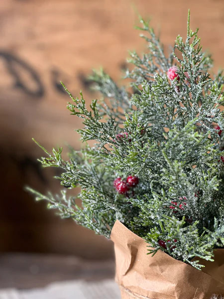 Glittering greenery accented with festive berries are ensconced in charming paper wrapped pots to create the sweetest addition your winter line!