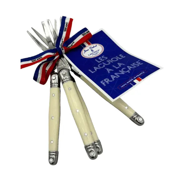 Transform your dinner parties with these beautifully crafted French cocktail forks from Jean Dubost. Featuring distinctive ivory handles and the prestigious Laguiole bee emblem, this set of four delivers authentic Gallic sophistication to your table. Meticulously made in France and presented with a tricolor ribbon, these forks are perfect for serving appetizers, canapés, and petit fours with style. Each piece reflects generations of French artisanal tradition, making them an essential addition for anyone who values refined entertaining and timeless elegance.