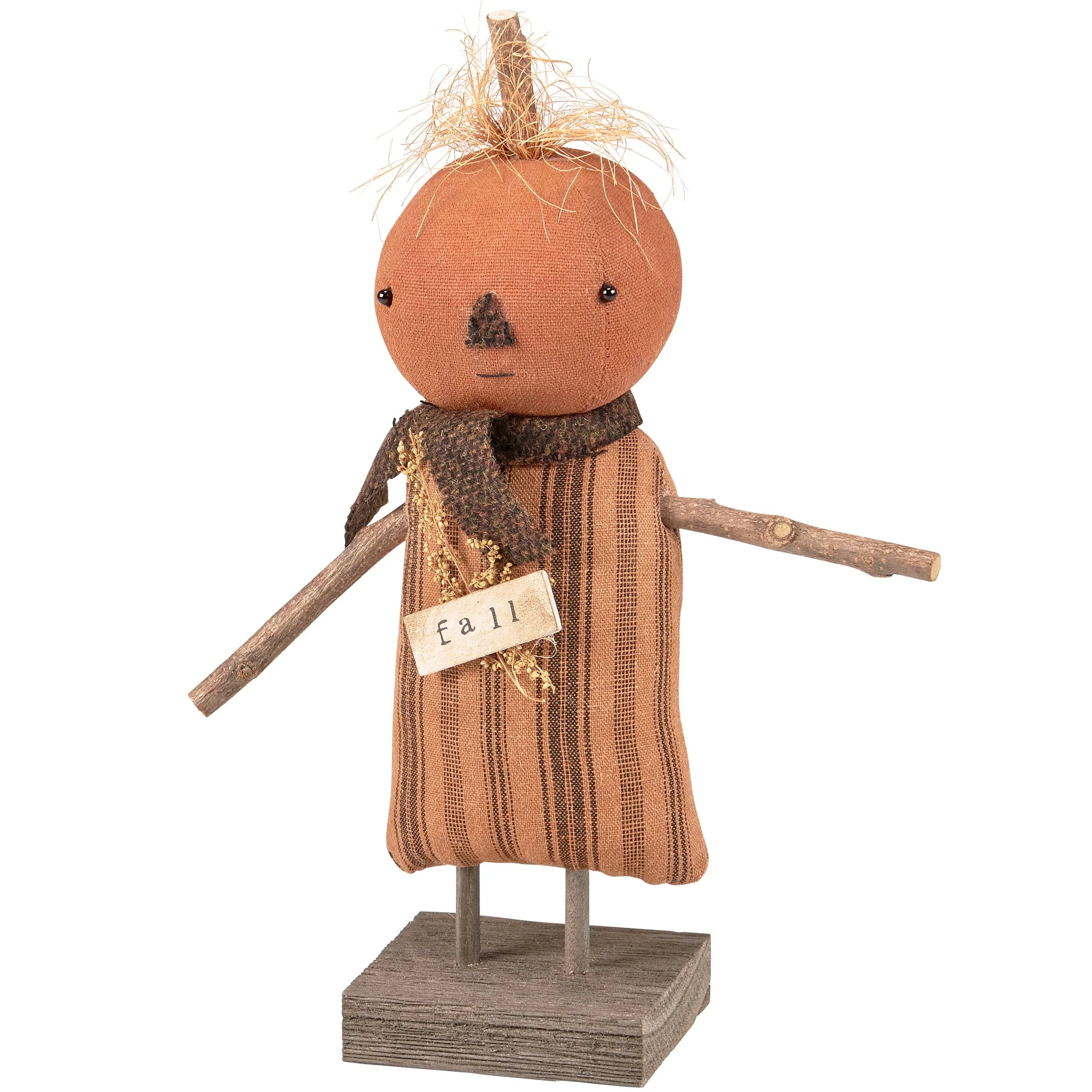 Capture the essence of autumn with the Gertrude Primitive Pumpkin Doll. Crafted from natural wood, fabric, and real foliage, this charming figure features a rustic, distressed "Fall" sign that embodies seasonal warmth. Designed to stand freely on any flat surface, Gertrude brings a handcrafted, timeless touch to your fall décor, making it an inviting focal point for your home throughout the season.