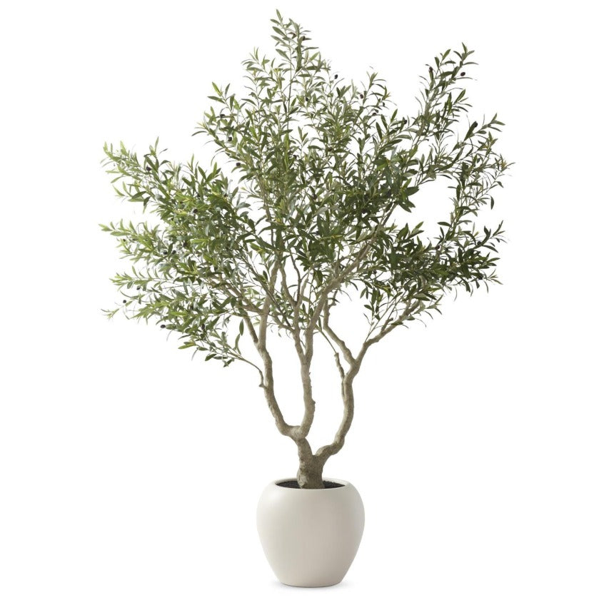 Make a bold design statement with this impressive 8-foot faux olive tree. Its realistic proportions and neutral white pot blend effortlessly with any interior style, whether contemporary, rustic, or eclectic. Enjoy the timeless appeal of Mediterranean greenery without watering, pruning, or sunlight concerns. A sophisticated accent that elevates your home's aesthetic instantly and permanently.
